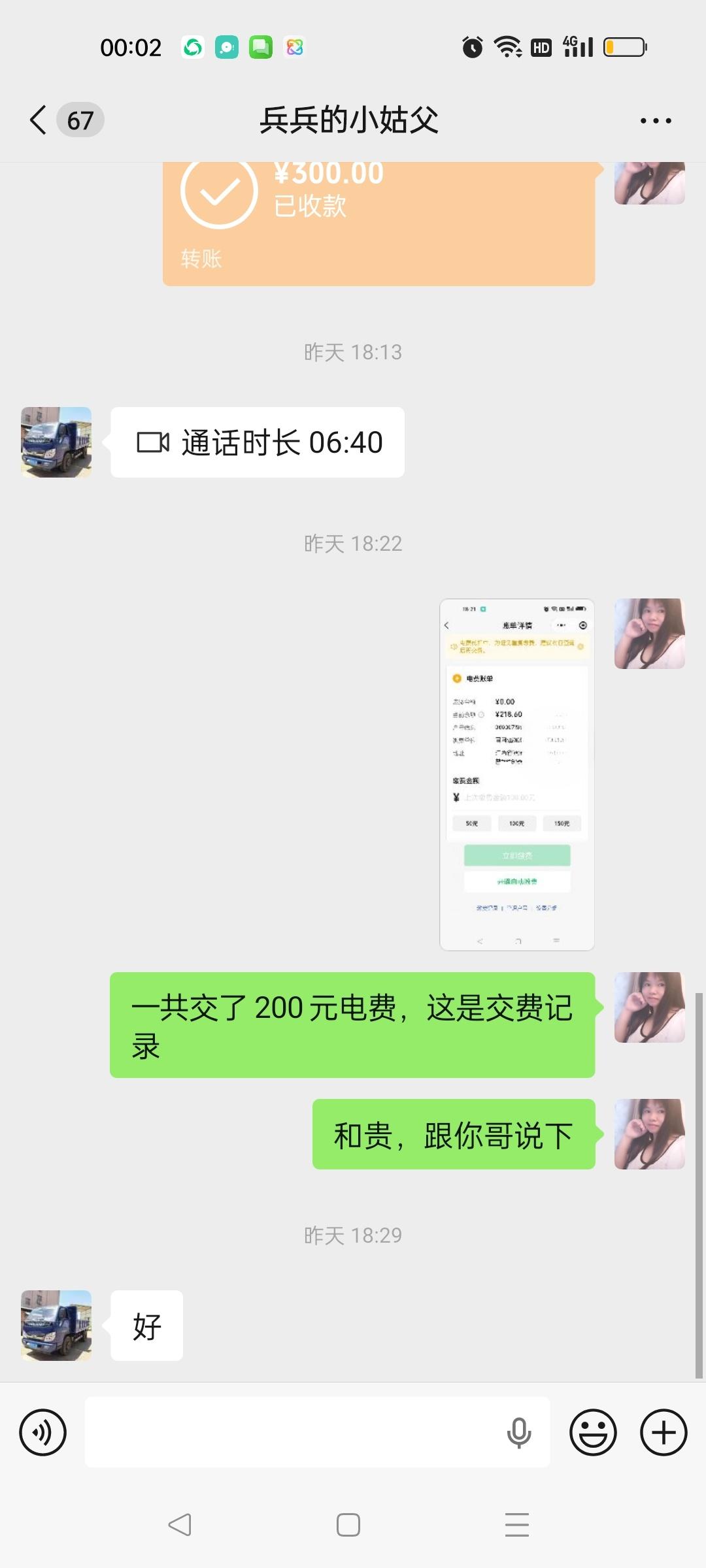 这会儿他就知道我的厉害了,求我帮他,我说没有钱,他又拉黑了我的微信,然后他就叫他的妹夫转300元钱给我交电费。