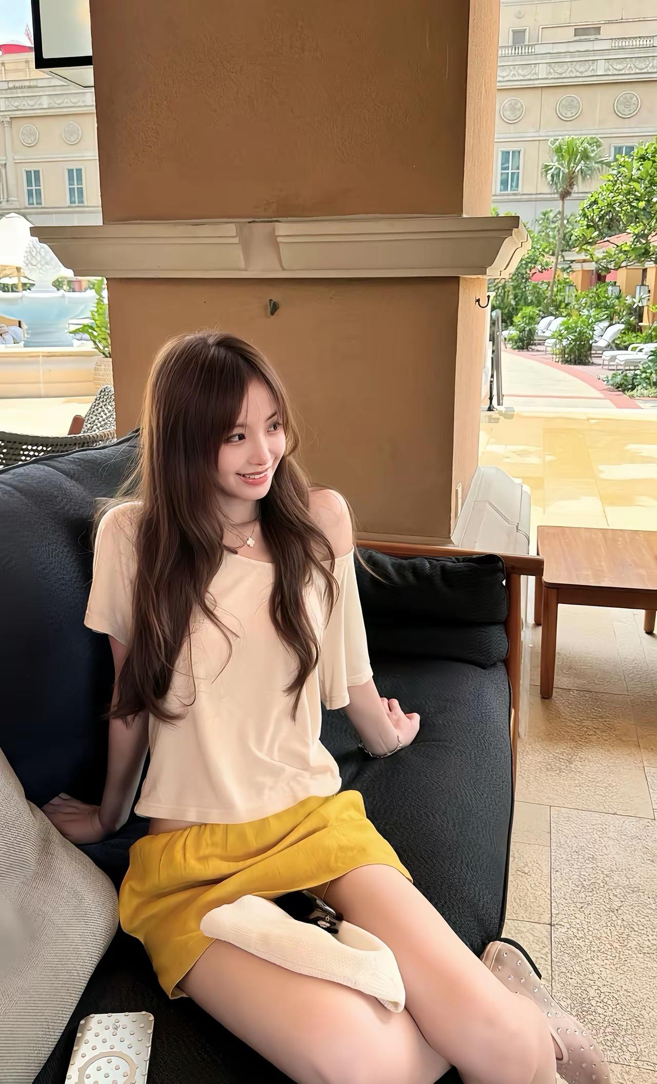 米色上衣➕黄色🟡半裙,真是亮眼的搭配