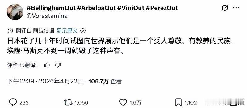 马斯克在2026年3月底更新了X平台推荐算法和自动翻译,打破了语言壁垒。马斯克也没想到自己的这一举动,瞬间打得日本右翼数十年的虚假叙事溃不成军。日语是个小众语言,以前没人看得懂,也不知道日语圈内都聊些啥。但是现在马斯克的自动翻译可以把日语翻译成其他任何语言,于是全球网民突然发现日本右翼数十年一直在美化侵略,拒不认罪。这下子,全球网络都炸锅了,认清了日本的虚伪和丑恶,然后迅速展开口诛笔伐。