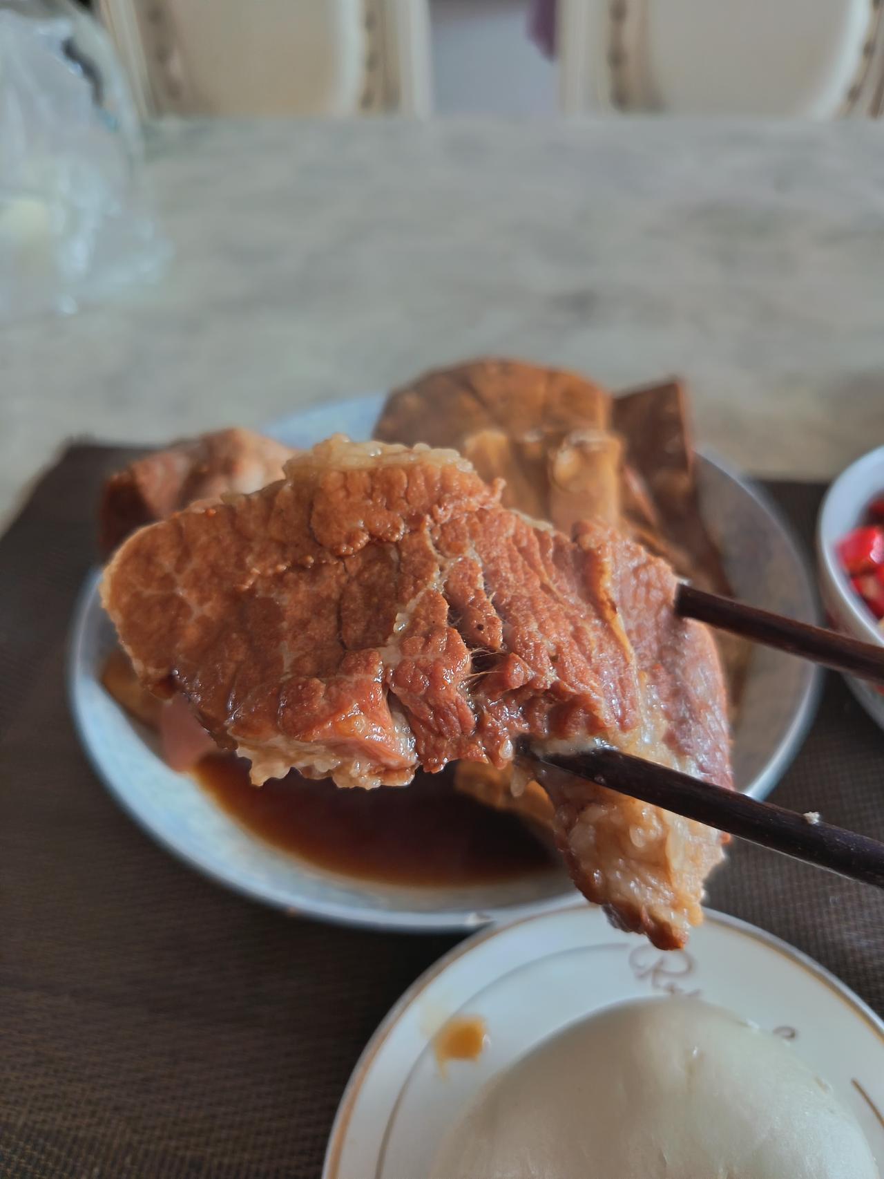 大块的吃肉就是香啊,再来一口山东老面馒头,太得劲了!