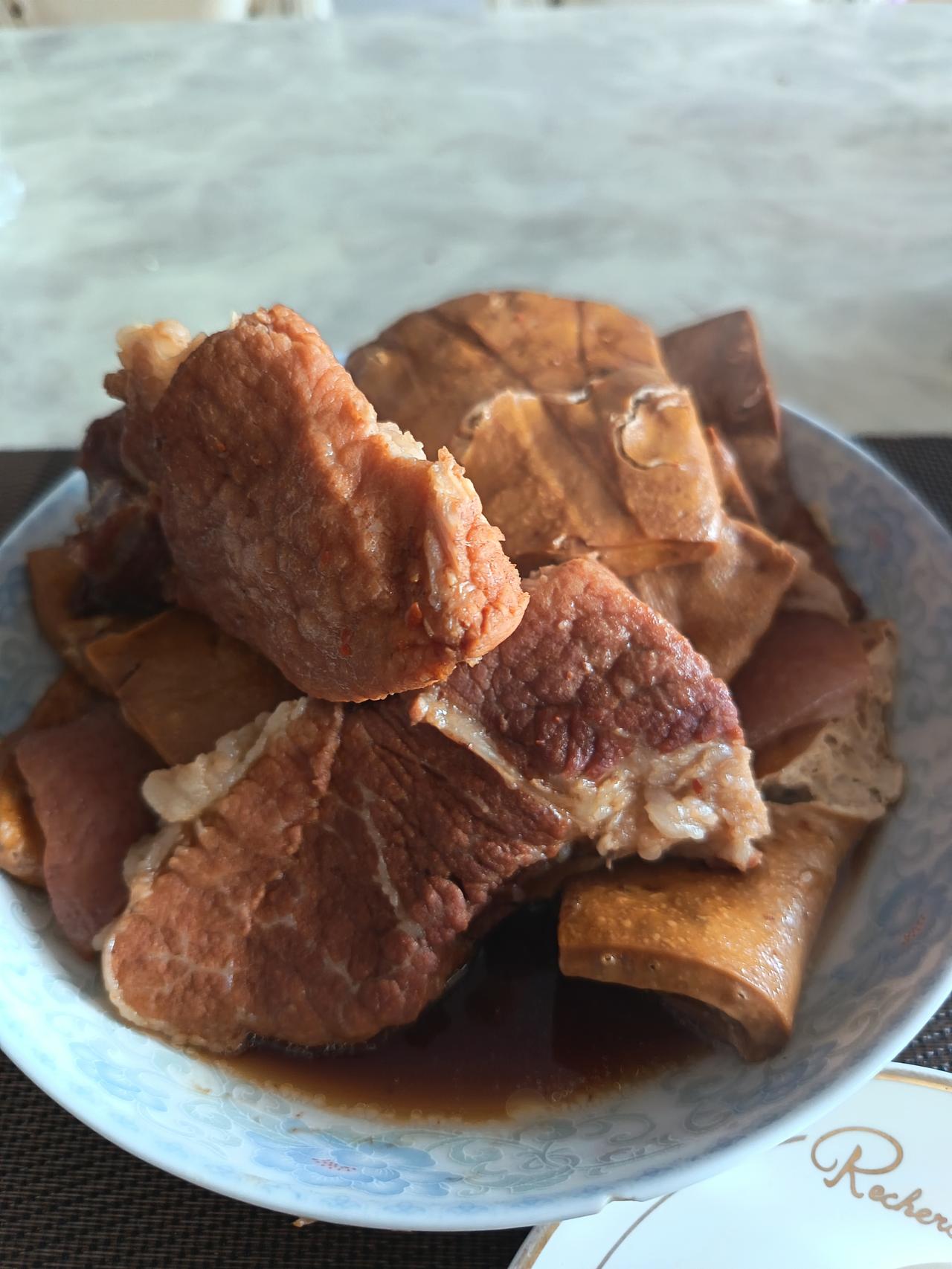今天买了三斤剁刀肉,18块钱,买了6块钱的香干,用高压锅卤了满满的一锅子。