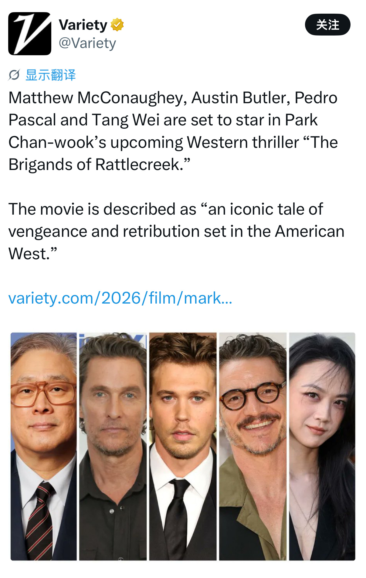 汤女士作品新动向!!继《分手的决心》后二搭朴赞郁导演出演西部惊悚片《拉特伯格强盗》(The Brigands of Rattlecreek),主演阵容还包括:马修·麦康纳、奥斯汀·巴特勒、佩德罗·帕斯卡。