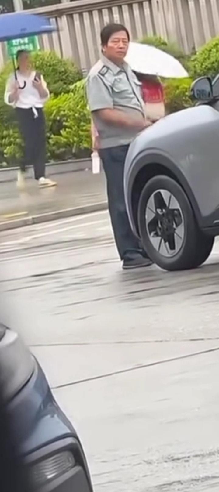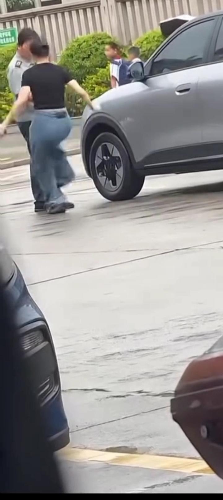 女人下车跟保安论理,无意识中,摆腿扫了一下保安,从视频看不到女司机踹保安这一脚的落脚点是否能接触到保安的肢体。