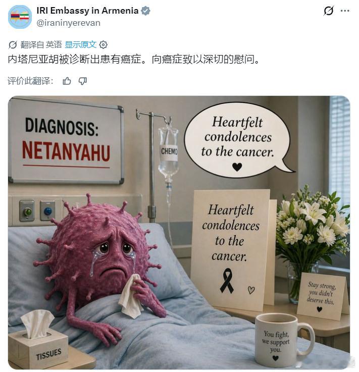 《华盛顿邮报》:内塔尼亚胡(战犯)表示,他被诊断出患有早期前列腺癌并接受了治疗,但推迟了两个月才透露他的病情,以避免在与袭击伊朗期间被利用来对付以色列。伊朗驻亚美尼亚大使馆:癌症被诊断为内塔尼亚胡。向癌症表示衷心的哀悼。美以伊冲突巴以冲突海外新鲜事黄媒不会说的真相