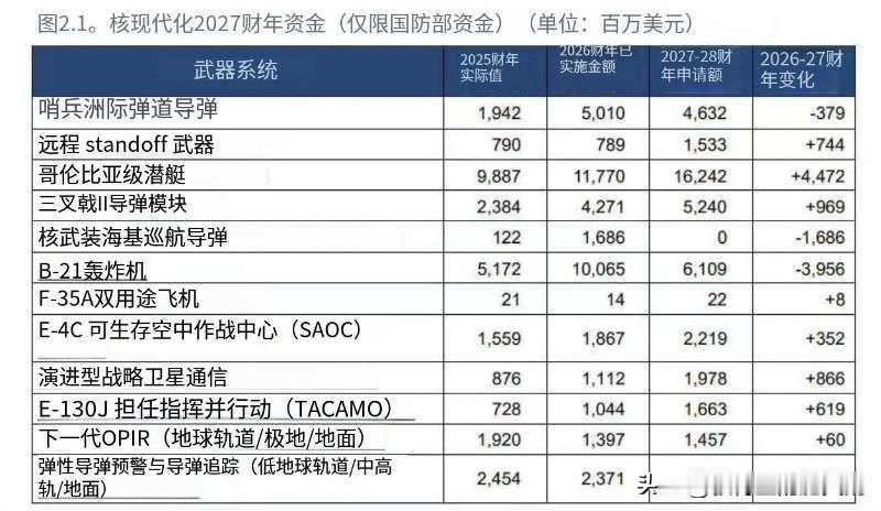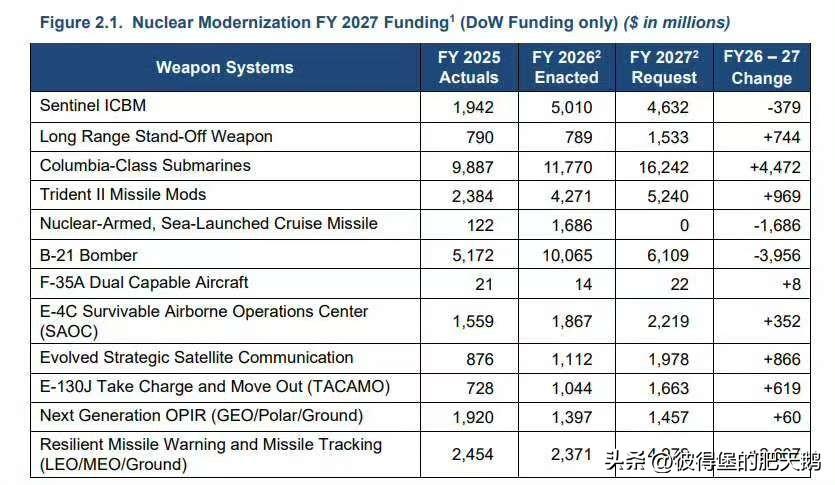 2.哨兵/B21经费降低、海射核巡航彻底砍掉、LRSO经费大幅增加、低轨反导预警经费大幅增加;