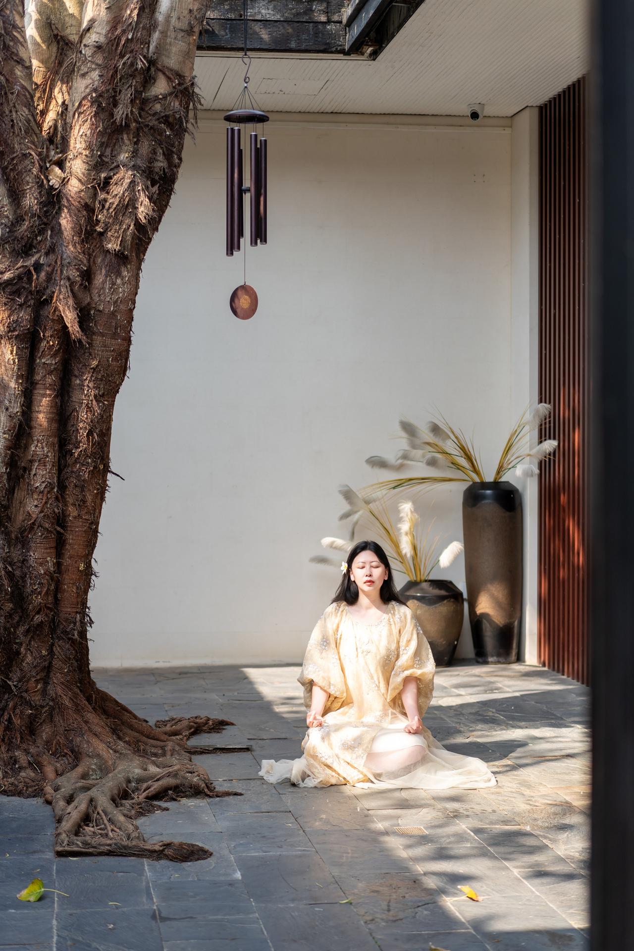 中间有一棵巨大的菩提树穿过天井,用绿荫把整个院子遮蔽得斑驳而灵动。这边有需要额外付费的颂钵和冥想课程,和自带静谧感的老师聊聊天,在颂钵的音乐声中,真的得到了从心底升腾出来的放松和宁静。