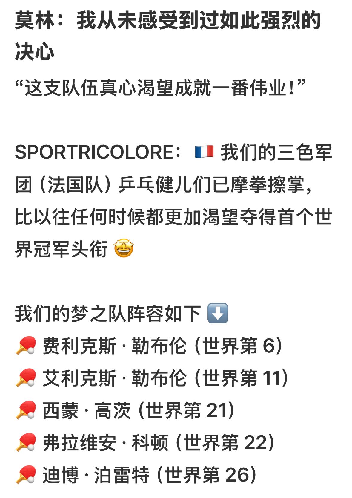 法乒男团教练莫林更新:我从未感受到如此强烈的决心,这支队伍真心渴望成就一番伟业!