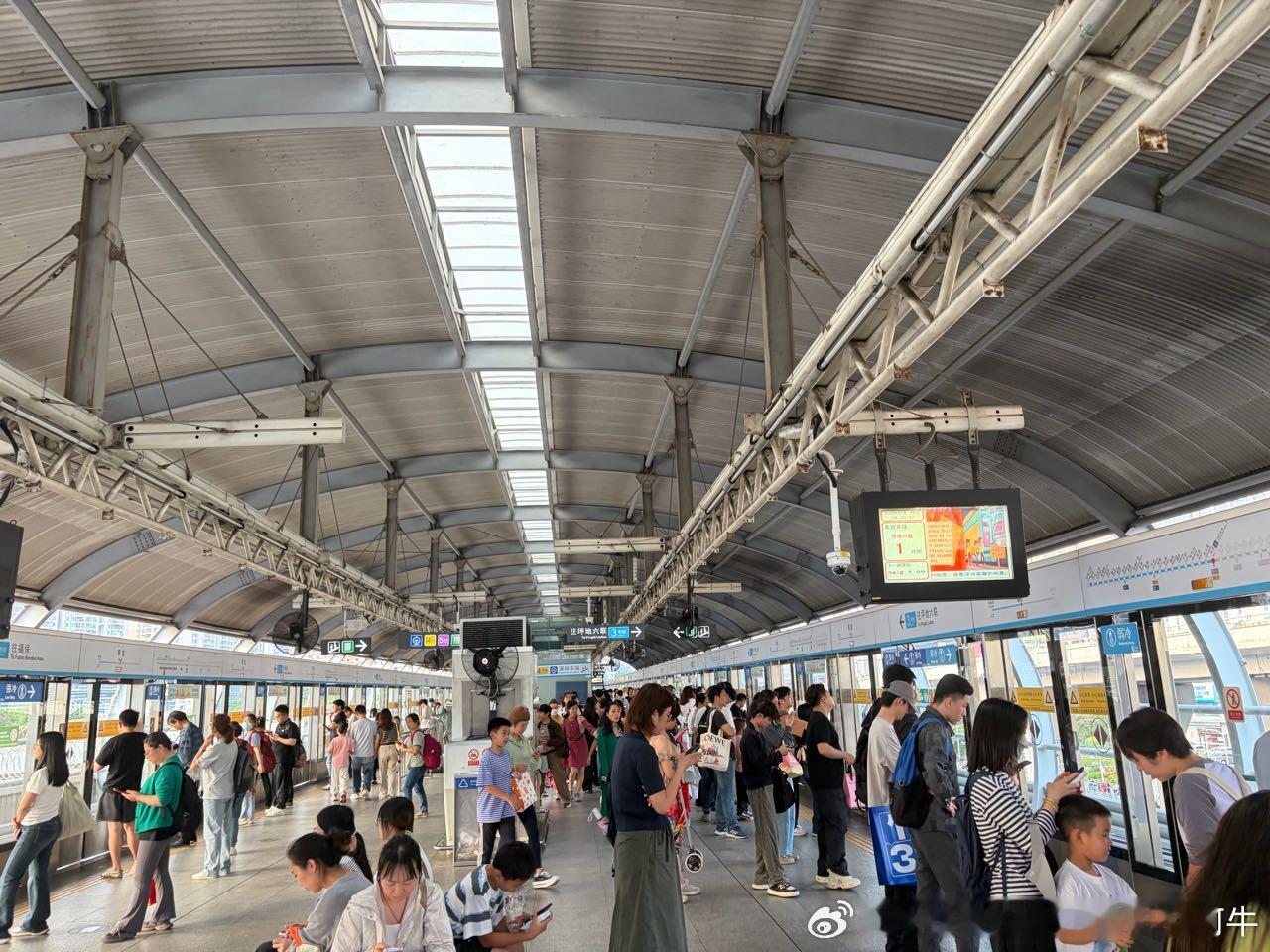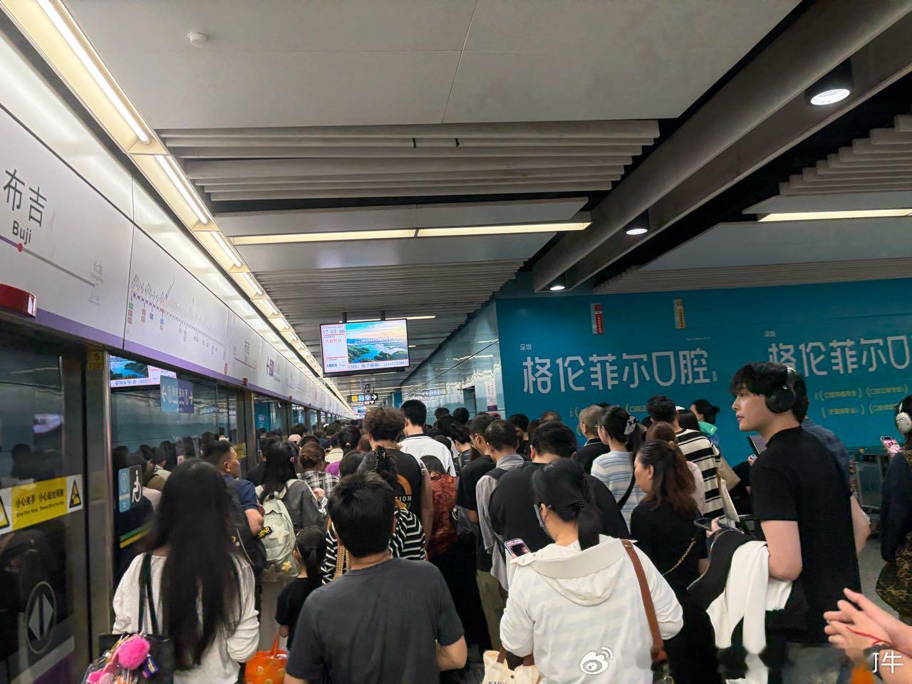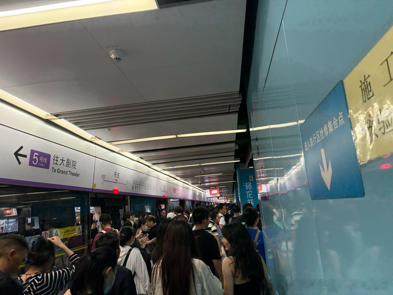 深圳地铁 网友:2026.4.25,星期六,17:55,深圳地铁5号线长龙-布吉区间(p1-p2)车内客流(行车间隔4分钟)、布吉站5号线站台(p3-p4)客流、布吉站3号线站台(p5)客流(行车间隔约4分钟)情况。
