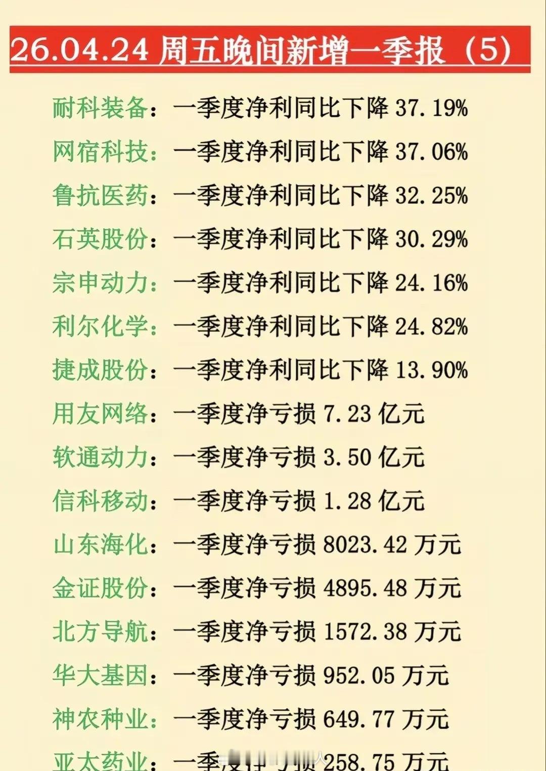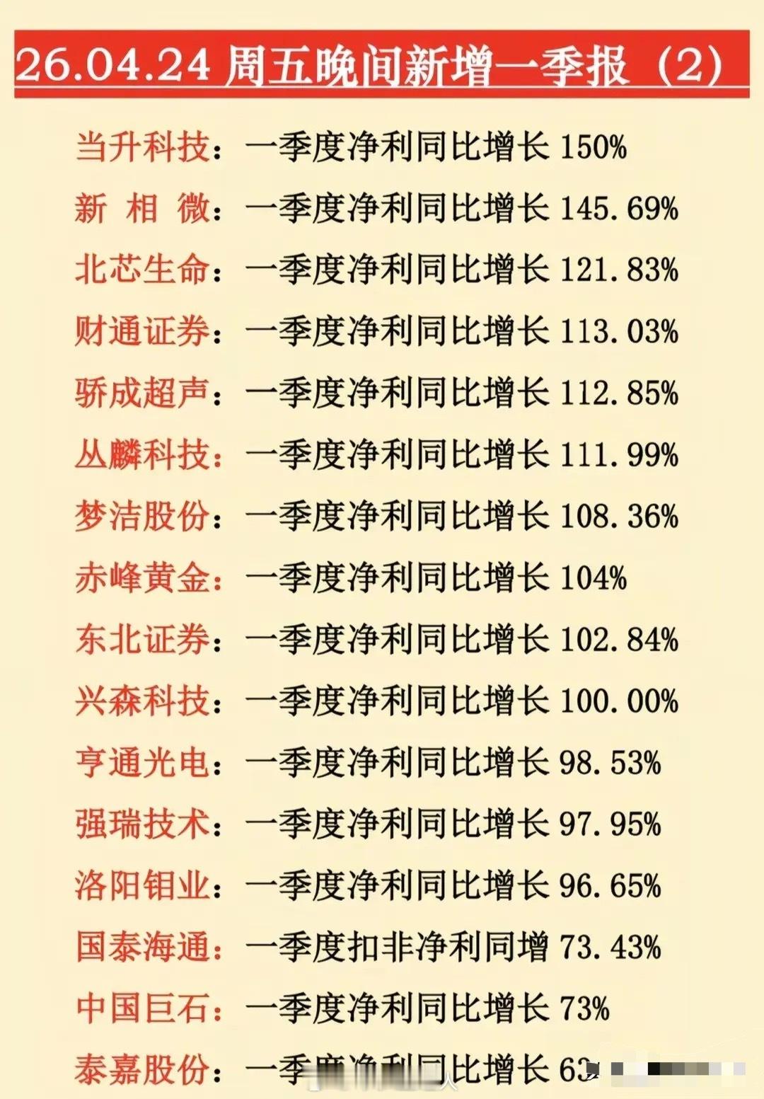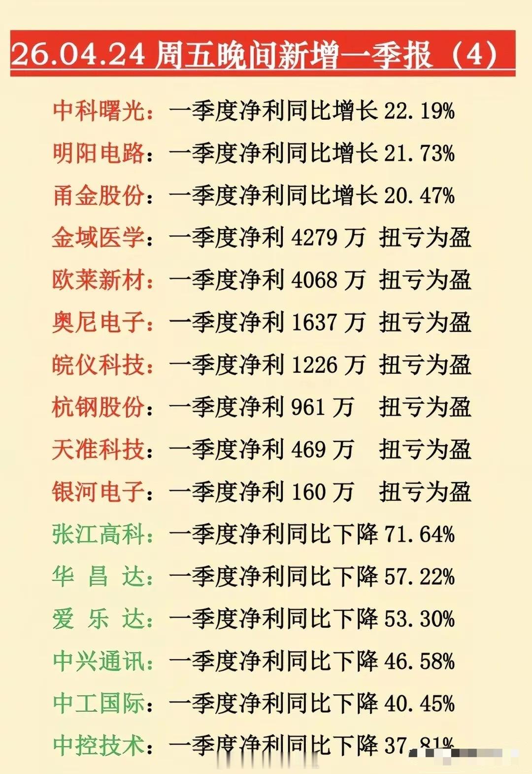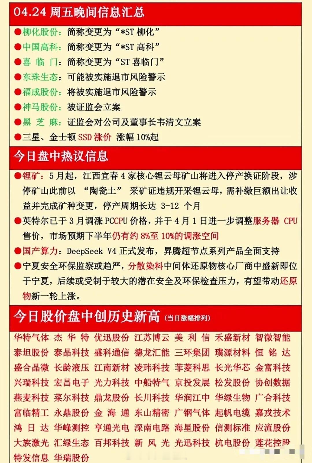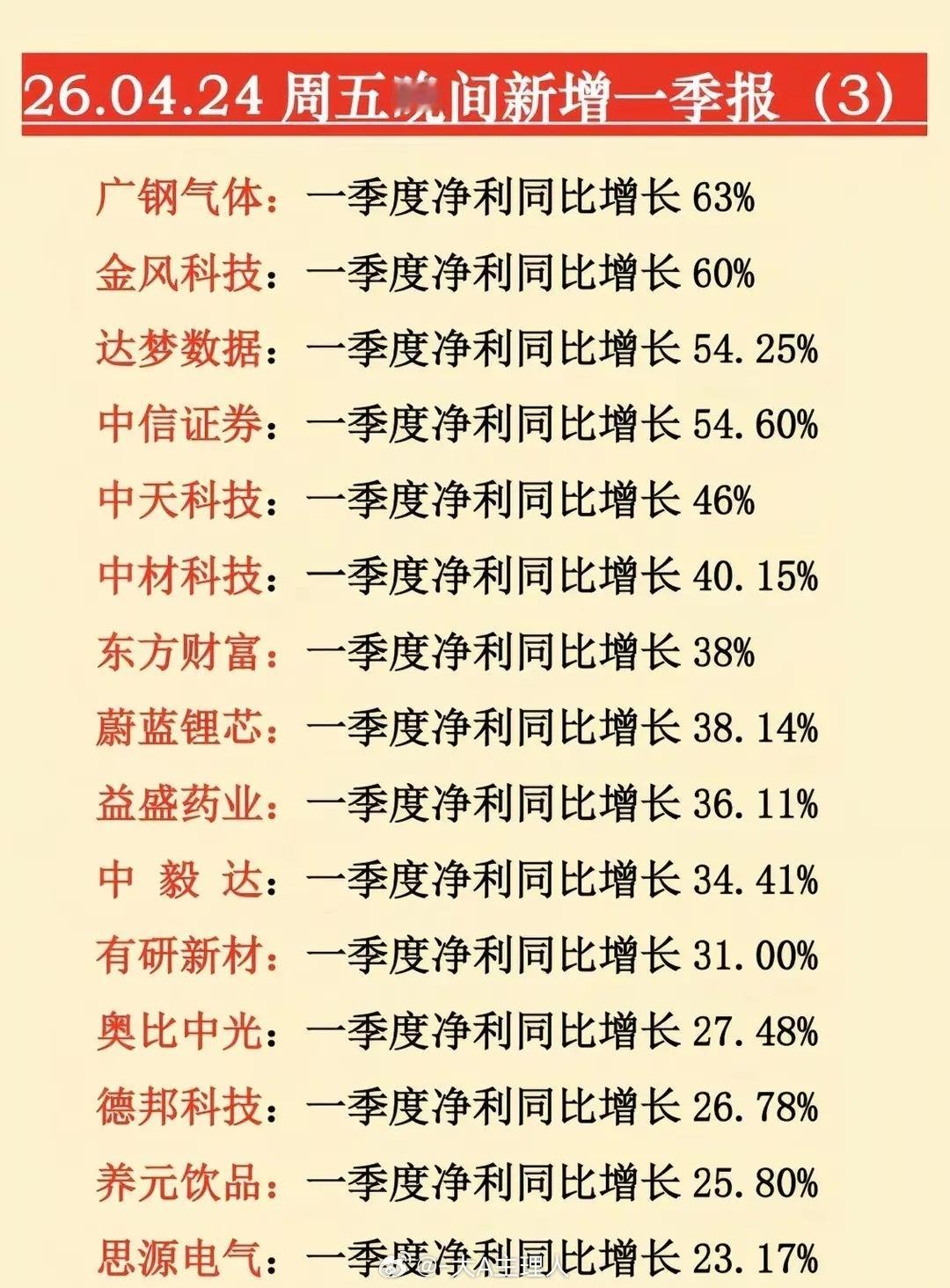 翻倍、扭亏、暴雷、立案!周五晚间这些信号要重视,一季报+市场消息汇总新鲜出炉,干货满满!业绩端看点十足,多只个股交出超预期答卷:飞南资源净利同比暴涨超79倍,派瑞股份、荃银高科等多股净利翻倍,广钢气体、金风科技等也实现稳健增长;同时,也有部分个股业绩承压,张江高科、中兴通讯等净利同比下滑,用友网络、软通动力等出现亏损,还有金域医学、欧莱新材等成功扭亏为盈,大家要擦亮眼睛仔细甄别。消息面上风险与机遇并存:柳化股份、中国高科等被实施退市风险警示,神马股份、黑芝麻遭立案调查,需要警惕风险;而锂矿停产、SSD与服务器CPU涨价、国产算力与分散染料中间体的利好催化,也带来了新的市场机会。此外,华特气体、杰华特等多股盘中创历史新高,市场主线热度不减。一季报行情正在演绎,业绩是检验个股成色的重要标尺,操作上建议优先关注业绩高增且契合市场主线的标的,同时规避退市、立案风险股,理性看待业绩波动,不盲目跟风,把握节奏,稳稳布局。
