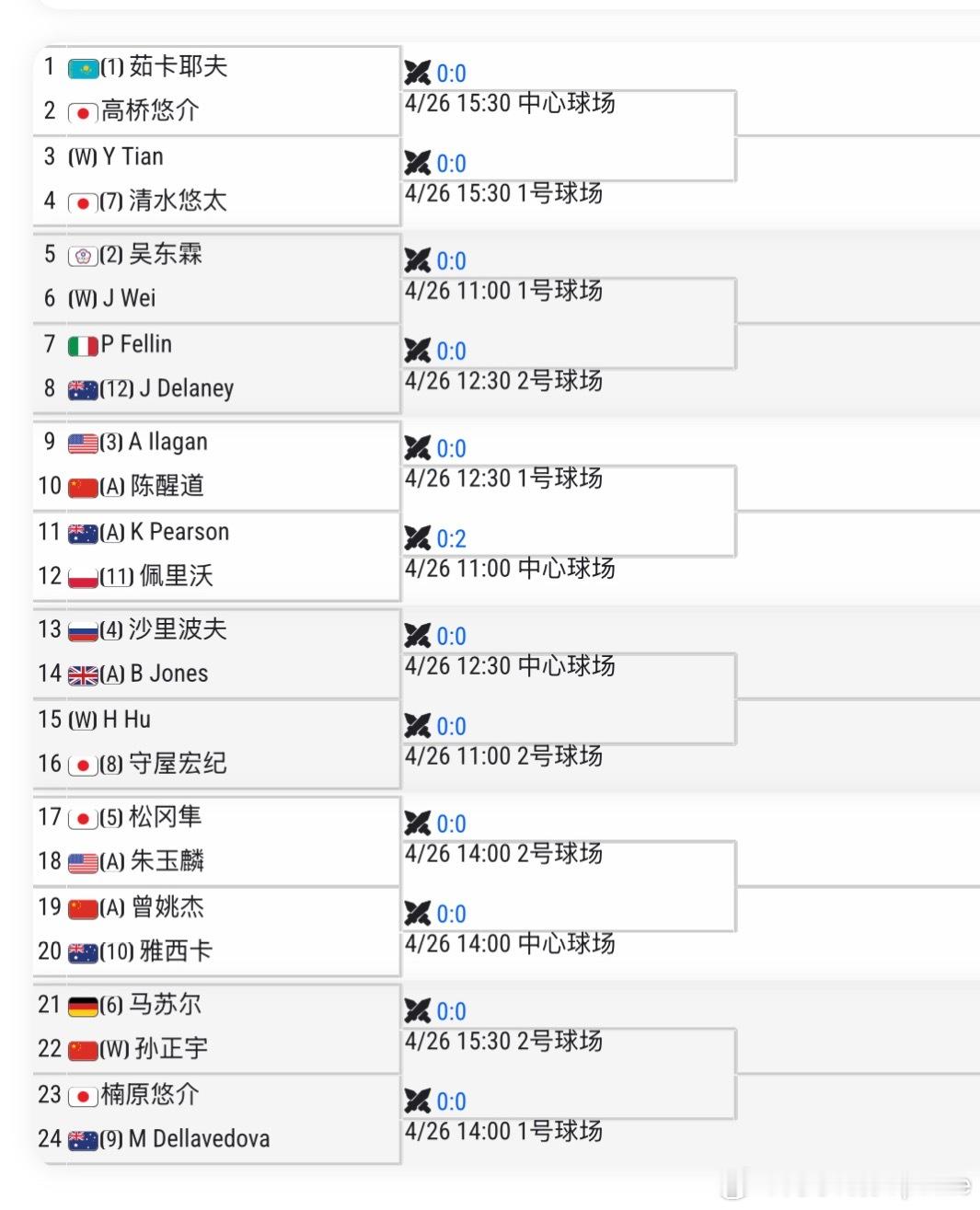 🇨🇳九江CH75签表🇨🇳布云朝克特vs Q🇨🇳孙发京vs 🇦🇺斯库凯尔特[WC]🇨🇳崔杰vs🇦🇺沃尔顿[WC]🇨🇳王傲然vs🇦🇺博尔特[WC]🇨🇳特日格乐vs🇦🇺埃利斯