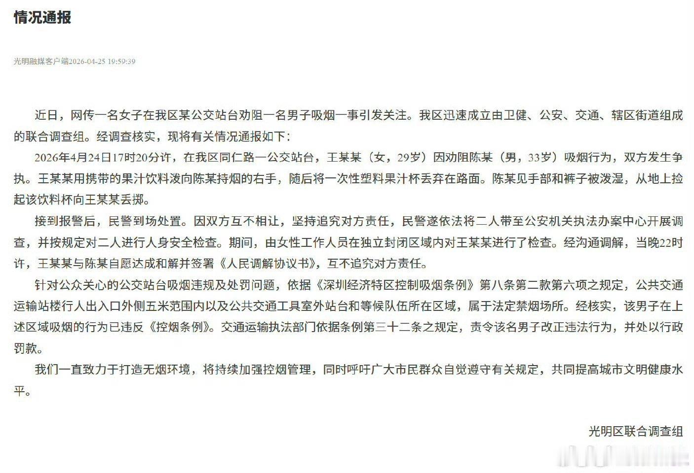 官方通报女子劝阻男子吸烟引争执官方通报来了。双方已达成调解,吸烟男子已被处罚。关