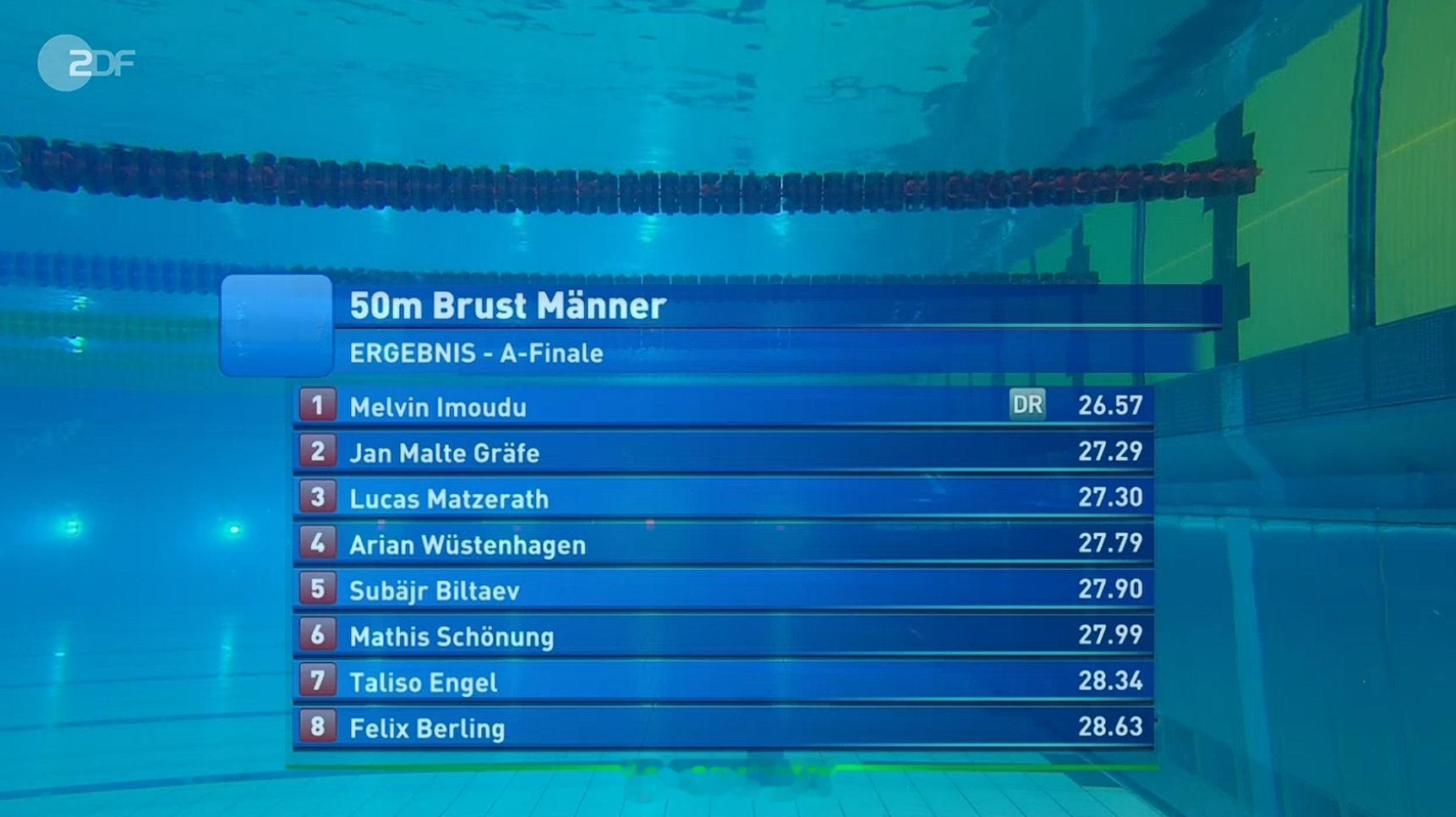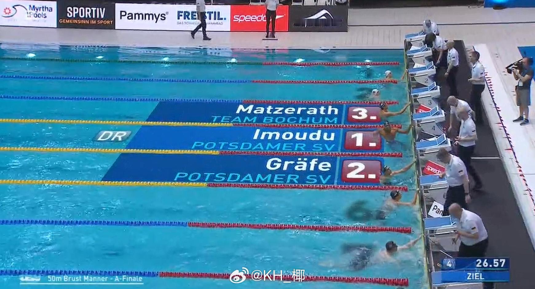 德国游泳锦标赛 男50蛙决赛Melvin Imoudu 26.57 NR