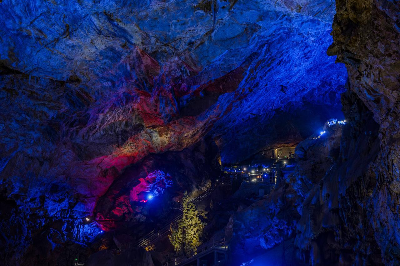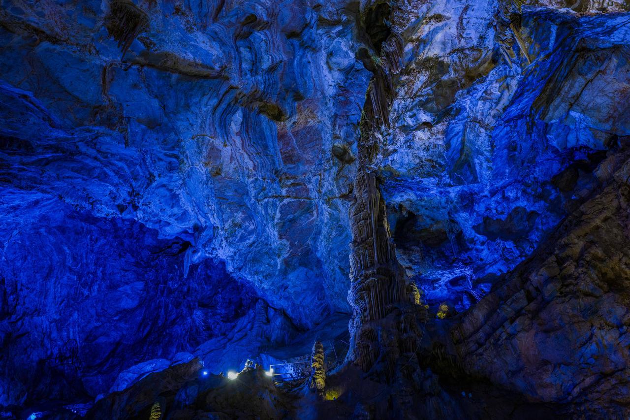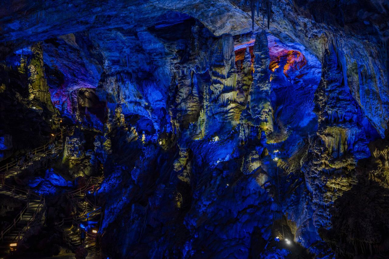 再往前走几十步,哇塞!瞬间豁然开朗。地下暗河静静流淌,石笋直插穹顶,灯光一打,穹顶宛如星河倾落。转角处“梯田”层层、“雪峰”晶莹,一步一景,仿佛进入了梦幻之境,每走一步都有“柳暗花明又一村”的惊喜。