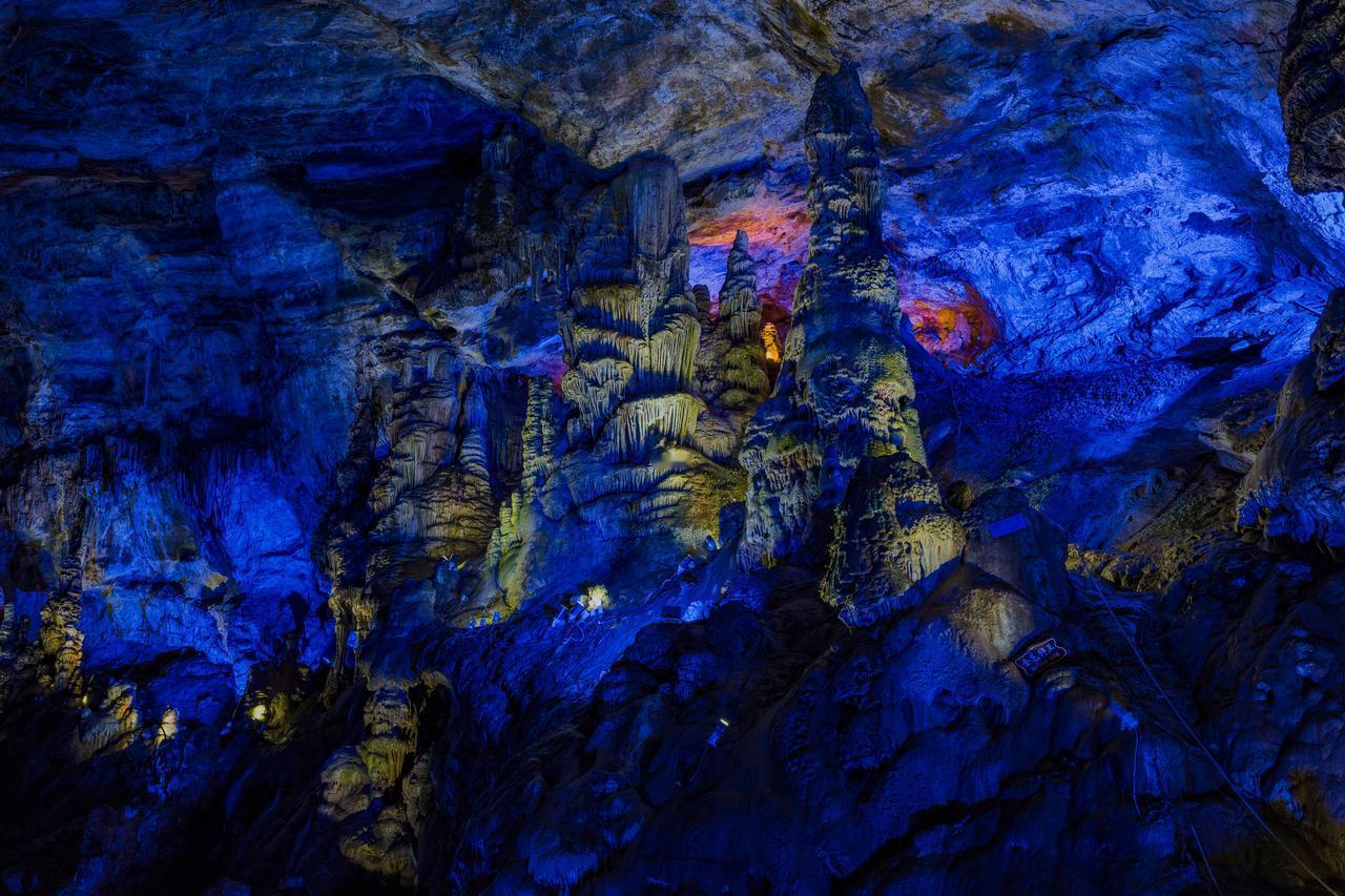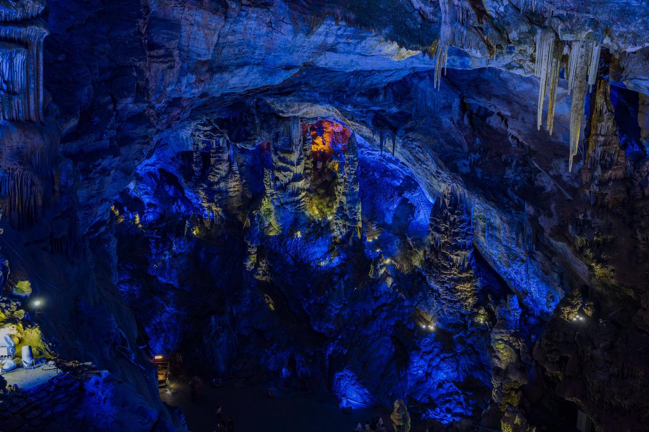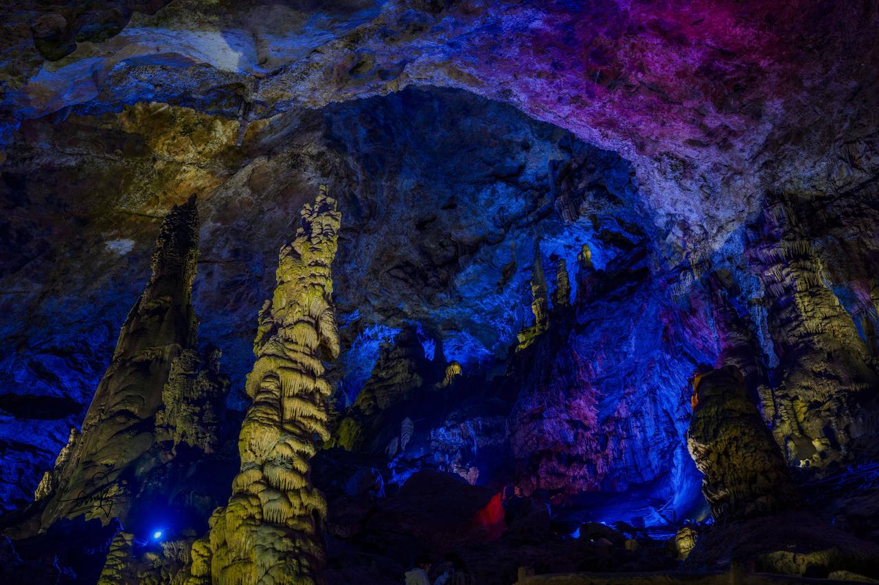 再往前走几十步,哇塞!瞬间豁然开朗。地下暗河静静流淌,石笋直插穹顶,灯光一打,穹顶宛如星河倾落。转角处“梯田”层层、“雪峰”晶莹,一步一景,仿佛进入了梦幻之境,每走一步都有“柳暗花明又一村”的惊喜。
