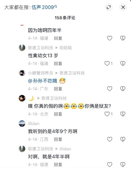 近期抖音评论区有网友爆料了09的最新消息,称“09被判四年半因XQ13岁幼女”,具体如下---