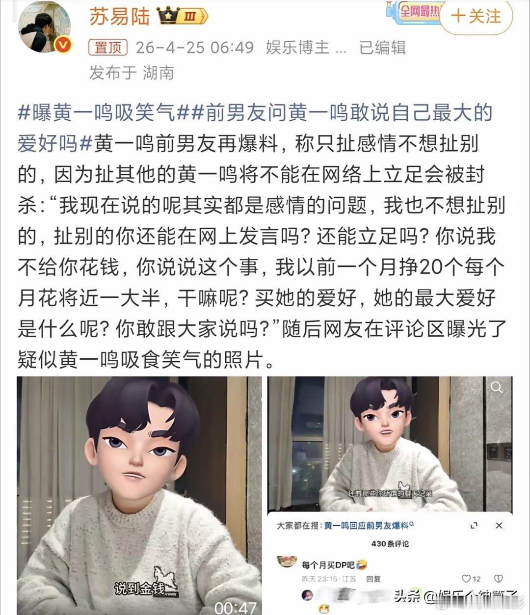 黄一鸣前男友再爆料,要求公开道歉,放话要动真格的了!4月25日,黄一鸣前男友晒出视频,再次爆料,这一次,可不是简单曝出大瓜,态度非常的坚决,感觉好戏又要上演了。前男友表示,我现在只是说感情问题,如果说点别的,你还想在网络上立足?并透露每月收入20个W,一大半都给黄一鸣花了,除了项链和家具,还有最大的“爱好”(这里特意停顿,大概意思,她不敢跟大家说)。此外,前男友喊话黄一鸣,随时可以对质,并要求对方公开道歉,还放话,如若不然,下一条视频,就要动真格的了。值得注意,前男友提到这个“爱好”,没有直说,感觉表达有点隐晦,说话如此有底气,手里应该真有料吧!其实,此前的爆料,黄一鸣也回应了其中的几点,特别是孩子生父的质疑,表示女儿闪闪100%是王思聪的。本以为这场风波就算过去了,没想到,前男友再爆料,不依不饶,看来,事情还没完。如此一来,难题抛给了黄一鸣,这次该如何应对,一起拭目以待。