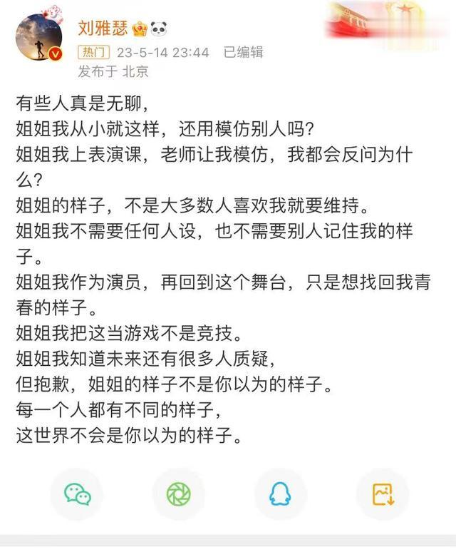 还有她说微博当朋友圈,十几年都这样,其实作为公众人物,还是尽量少发言,现在没红,一旦红了会引来很多麻烦,人红是非多,祸从口出,还得谨慎为妙。霍汶希也不管管,看来刘雅瑟的个性真的很刚。