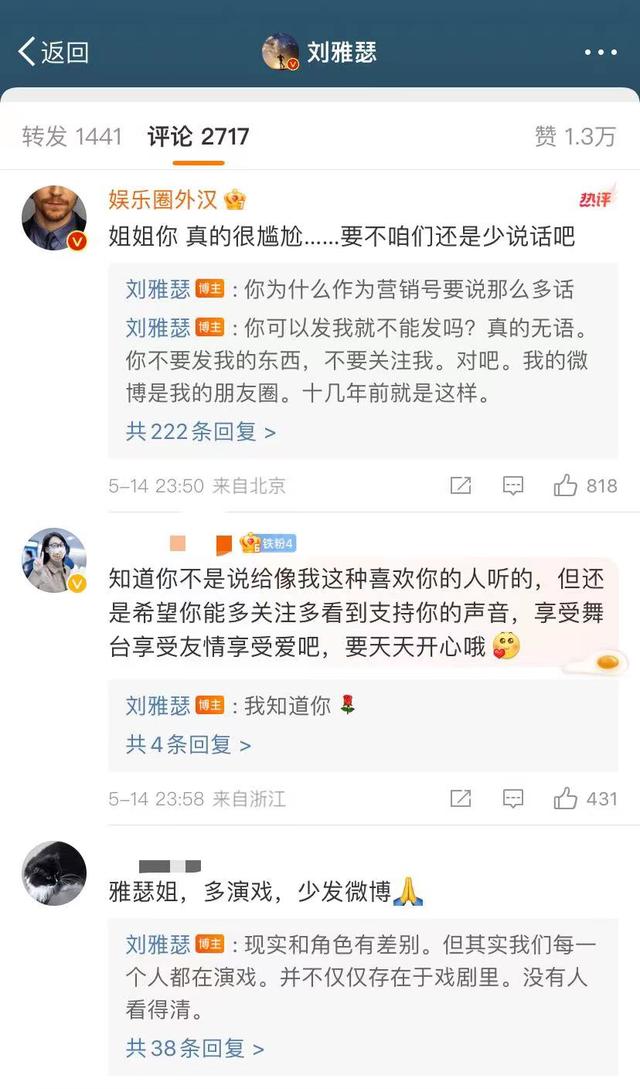 有网友表示多演戏少发微博。刘雅瑟似乎不愿意这么做,表示现实和角色有差别,但其实我们每一个人都在演戏,并不仅仅存在于戏剧里,没有人看得清。