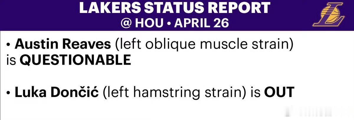 湖人这边——里夫斯(腹斜肌拉伤)出战成疑!东契奇(腿筋拉伤)明日缺席!