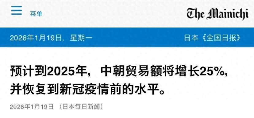 中国海关总署1月18日宣布,2025年中朝贸易总额约为27.35亿美元,比上年增长25%,恢复到2020年朝鲜全国闭关之前的水平。