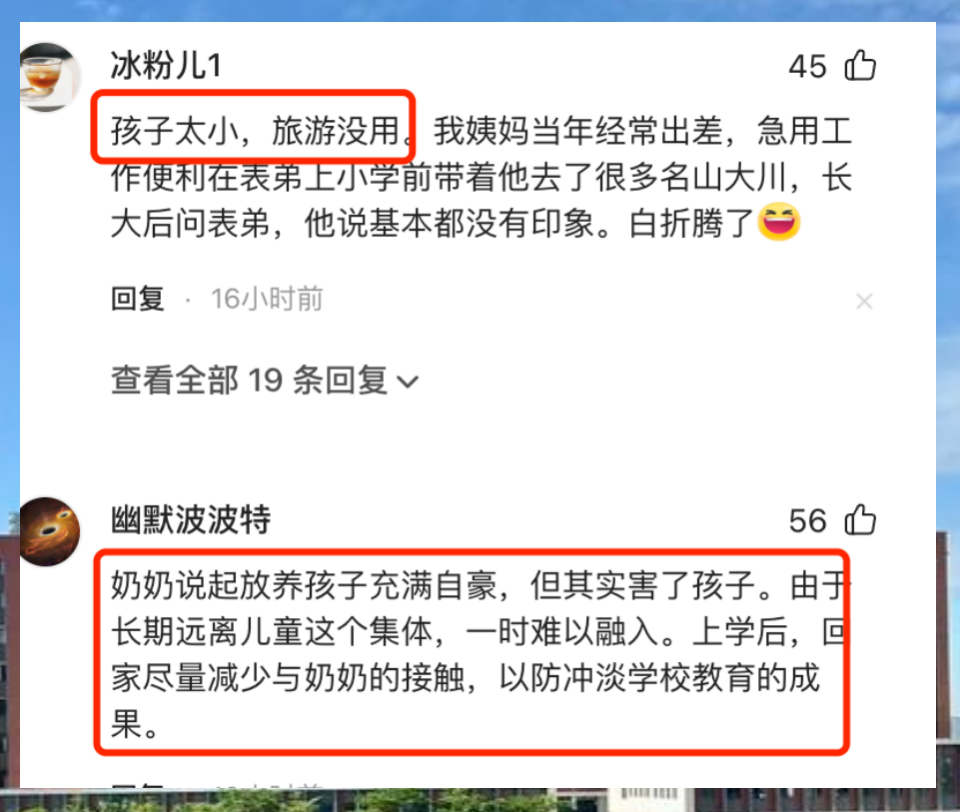 不少网友反对奶奶这种带孙方式:“孩子太小,旅游没用”、“长大了一点也不记得”、“这不就是现代版狼孩吗”。这些批评基于一个逻辑:1岁半开始旅游,没有留下明确记忆的体验等于无效投入,孩子脱离集体生活的成长必然导致社会化缺失。更现实的指责是“占用公共资源”——校长每天早上的第一项工作是安抚一个特殊的孩子时,公共教育资源的公平性确实受到了挑战。