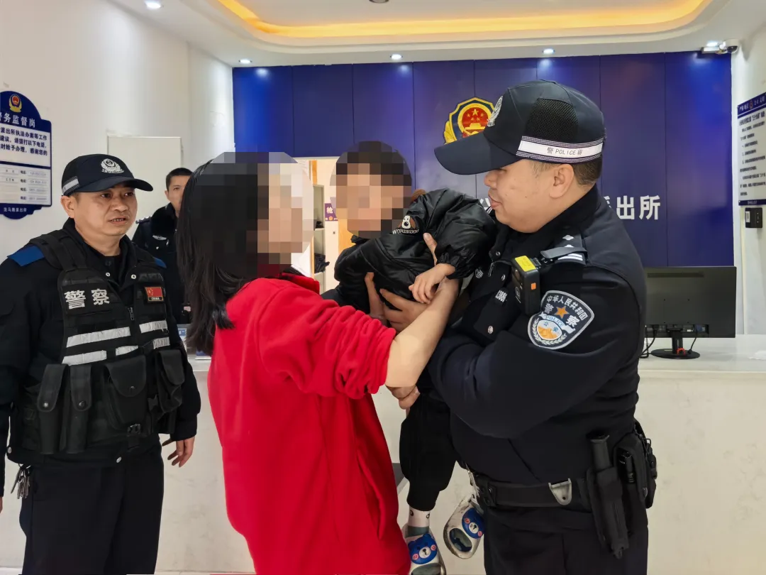 民辅警立即赶赴现场,将孩子安全带回派出所,化身“临时家长”悉心照料、耐心安抚。恰逢此时,派出所接到男童家长的寻人报警,经信息核对,确认系走失孩童的父母。