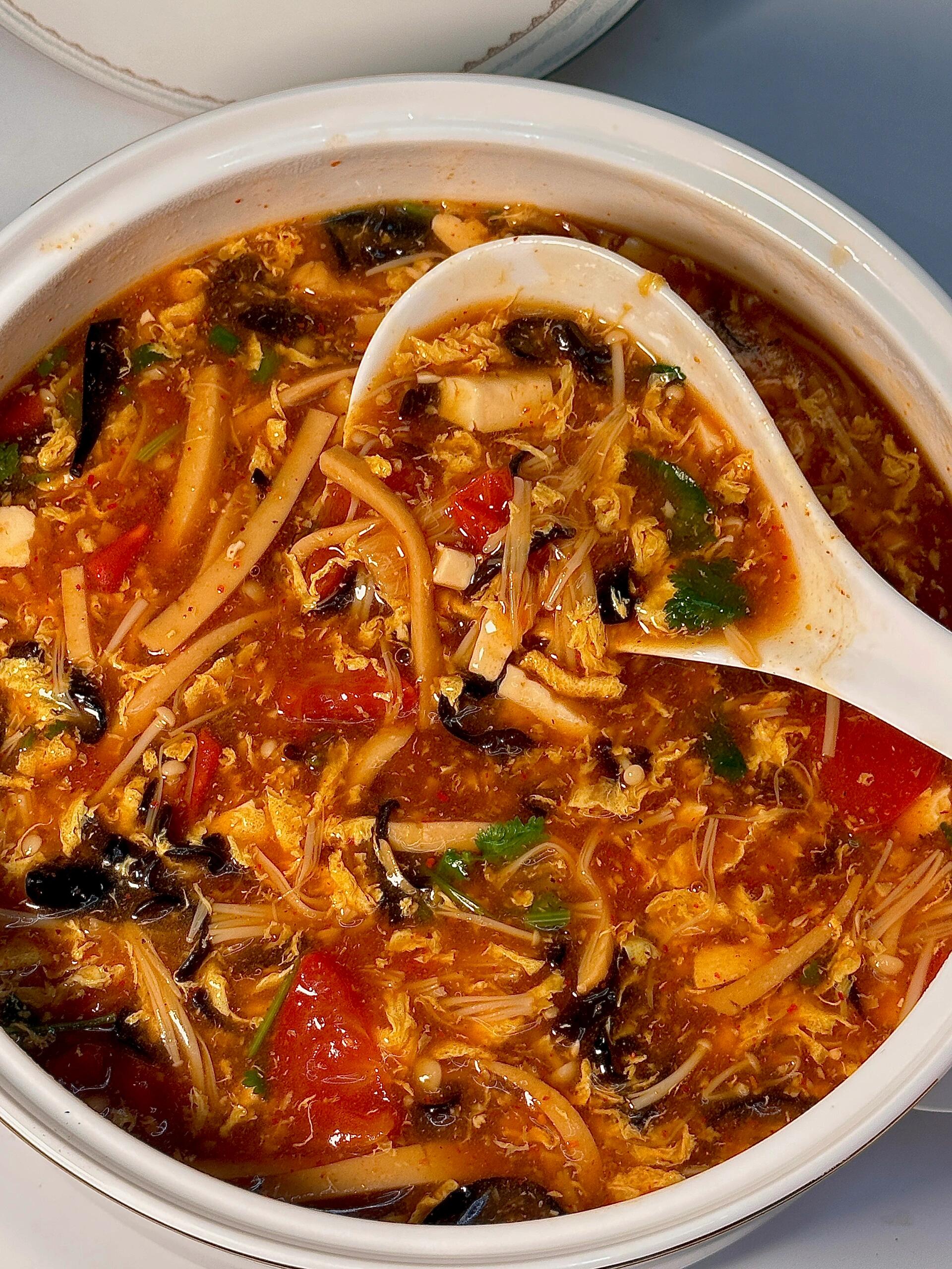 盛出一碗,热气腾腾。汤色红亮,蛋花金黄,豆腐雪白,木耳黝黑,金针菇和香菜点缀其间,光是看着就让人食欲大开。舀一勺送进嘴里,首先是酸,清爽的酸,激得唾液立刻分泌;接着是辣,温和的辣,从舌尖暖到胃里。各种配菜在口中交织—金针菇脆嫩,木耳爽滑,火腿肠咸香,内脂豆腐嫩得入口即化。那一口浓稠的汤羹,裹着所有的滋味,滑过喉咙,整个人都舒坦了。