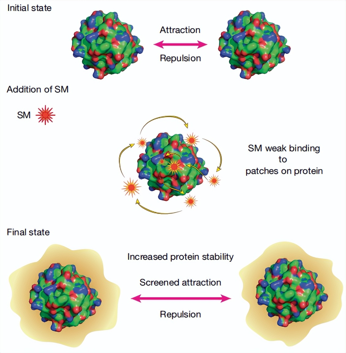 在分子尺度上,氨基酸等小分子正扮演着这样的“人群”角色,通过削弱蛋白质之间的有效吸引,使其难以相互靠近,从而显著提高体系稳定性。