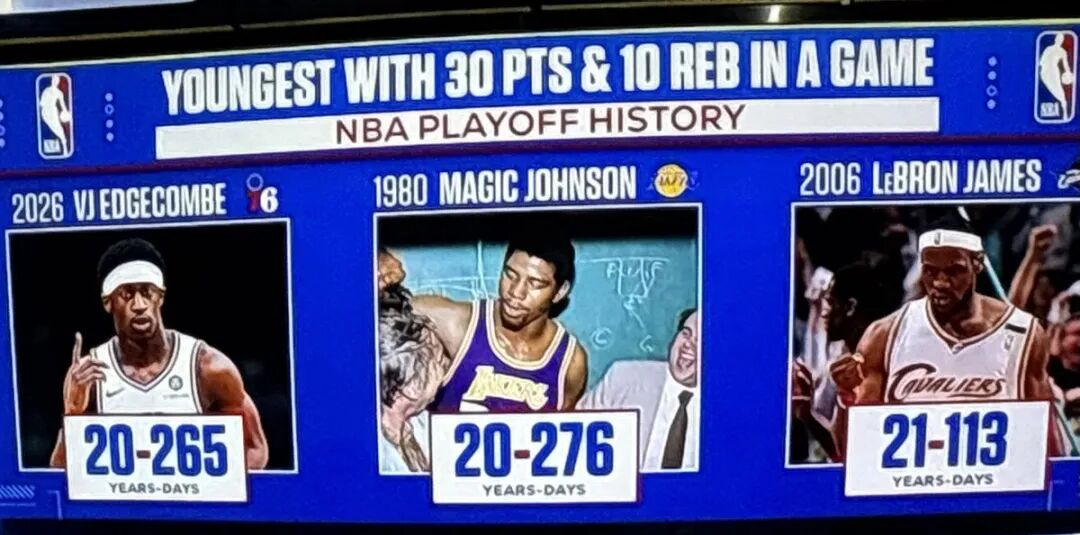 ——20岁265天单场30分10板,超越魔术师(20岁276天),季后赛历史最年轻