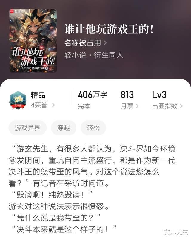 “名称被占用”作品,他的第二本万订游戏王同人,上本是《我在决斗都市玩卡牌》。这本起步成绩更高,首订破万,完结也保持在了万订以上。