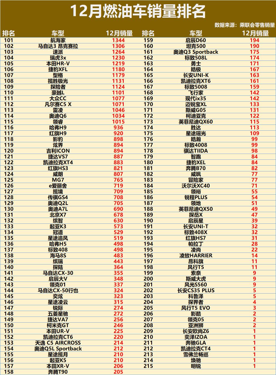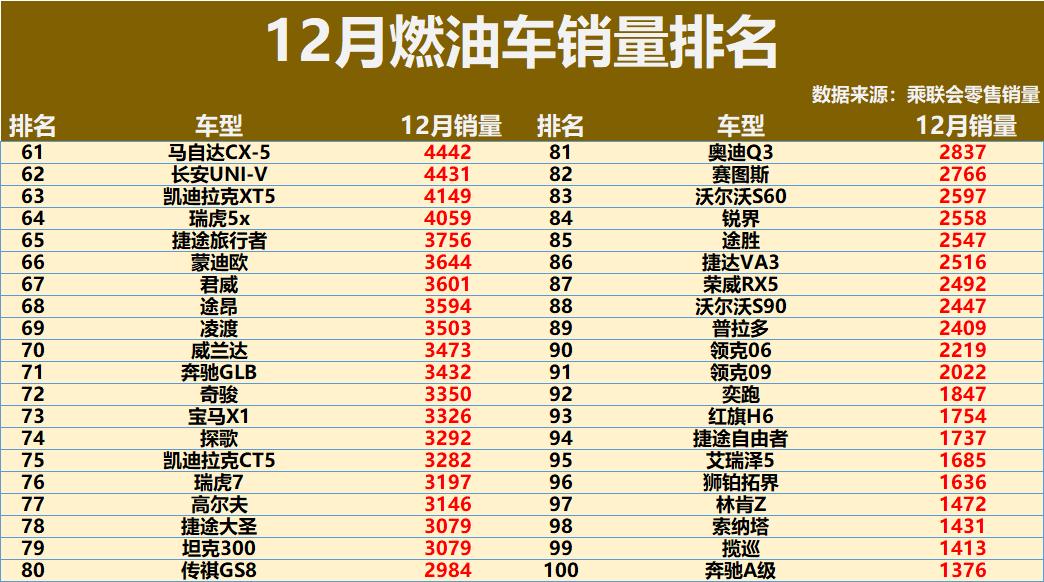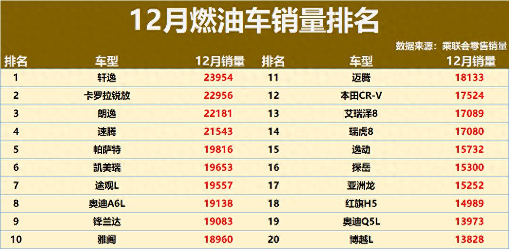 在新能源声势浩大的当下,燃油车并未一击而溃!根据乘联会最新公布的12月份销量数据来看,燃油车整体表现不错,轩逸、卡罗拉锐放、朗逸稳居前三,月销均超过2.2万辆。中型车市场由帕萨特、凯美瑞、雅阁、迈腾等老牌选手牢牢把控,销量集中在1.8万至2万辆区间。SUV阵营同样坚挺,途观L、本田CR-V、瑞虎8、探岳等车型持续热销。豪华品牌中,奥迪A6L、宝马3系、奔驰GLC和E级的表现依然稳健。整体来看,燃油车市场呈现出一种“核心稳固、边缘松动”的态势,头部车型依然受宠,但尾部车型却遭忽视。再次大胜!12月燃油车销量:1万辆进不了前30,帕萨特第5,皓影29!