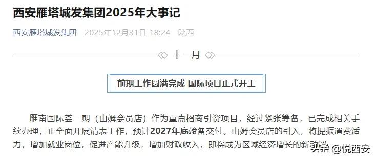 关于西安山姆的最新动态,来自雁塔城发集团发布的2025年度大事记文章,该集团系雁塔区国资局直属企业,负责区域综合性开发建设。