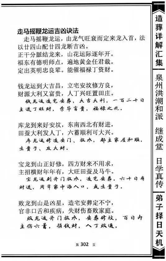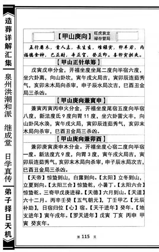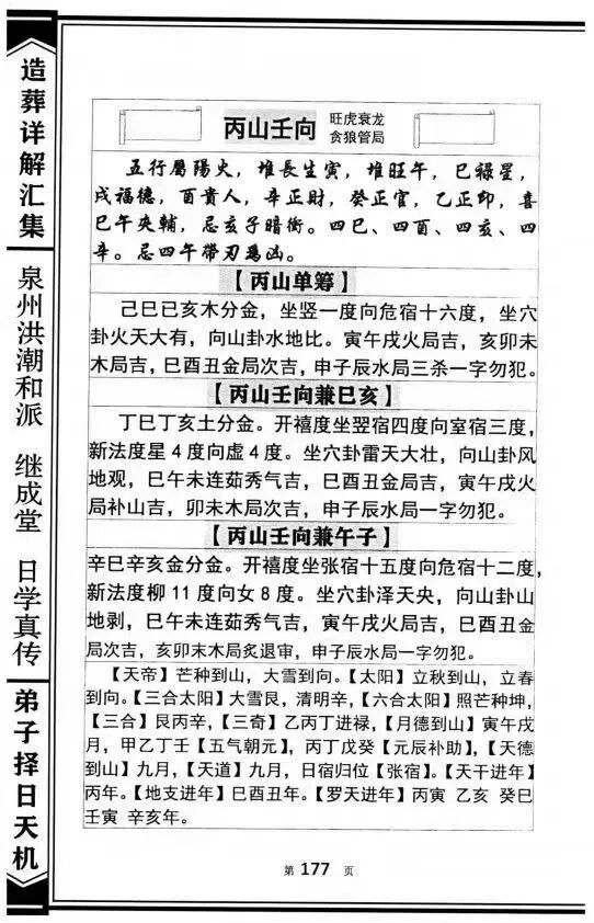 该书核心特色为“体系完整、详解实操、内容权威”,以“精准辨方、趋吉避凶”为核心宗旨,构建起“理论奠基-阳宅造法-阴宅葬法-择日宜忌”的完整造葬知识体系。核心内容聚焦造葬全流程,分类清晰且针对性极强:理论奠基部分,系统阐释二十四山的核心内涵——将罗盘360度精准划分为24个方位,每山占15度,由十二地支、八天干与四维卦组成完整方位体系,详解各山向的五行属性与卦气纳甲逻辑,为造葬方位选择筑牢理论根基;阳宅造法部分,重点讲解住宅建造的方位选址、坐向确定、分金校准等实操要点,包括如何根据主人生辰八字匹配有利山向,如何避开煞气、吸纳吉气,同时涵盖宅基地选择、房屋布局与周边山水环境的适配原则;阴宅葬法部分是全书精髓,收录担伞葬、正葬、悬棺葬等多种经典葬法,详细记载墓地选址的峦头判断、理气布局、金井开挖深浅等关键细节,明确不同龙脉走势对应的葬法选择,同时详解亡者生辰与安葬方位、时辰的匹配逻辑;择日宜忌部分,系统梳理造葬过程中的吉凶时日判断标准,结合元运变化与五行生克规律,为造葬各环节提供精准的择日指引,充分体现传统造葬“龙合向、向合水、水合分金”的核心原则。