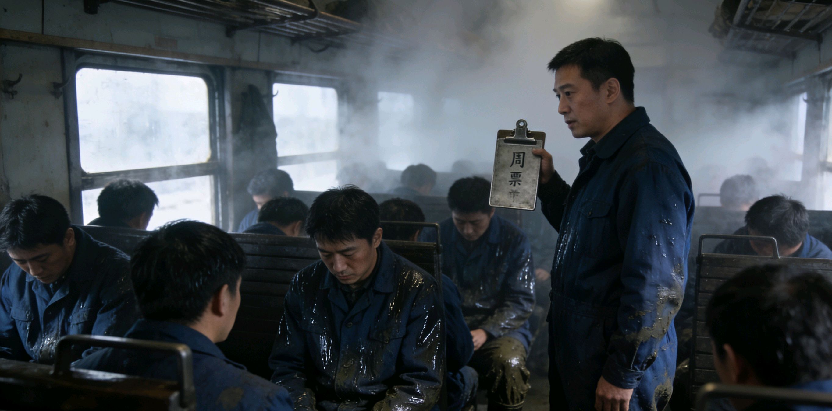 我走到那节车厢的门口,推了推门,没锁,“吱呀”一声开了。一股阴冷的风夹杂着水汽扑面而来,冻得我打了个哆嗦。车厢里的光线很暗,雾气蒙蒙的,能看见一排排座位上,坐着十几个人。他们都穿着深蓝色的工装,那种工装我见过,是二十年前轧钢厂的老款式,领子上还印着“红星轧钢”的字样,只是现在早就换成了灰色的工装。这些人,一个个都低着头,肩膀微微耸动着,浑身湿淋淋的,头发上还滴着水,裤脚管往下淌着泥浆,弄得车厢地板上一片湿漉漉的。