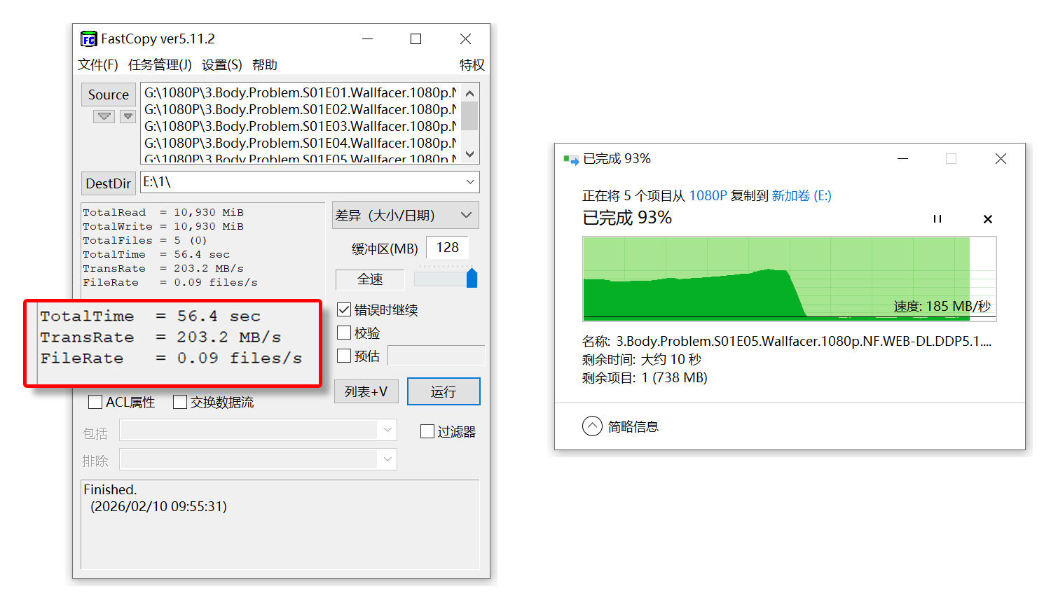 实际大文件传输场景下,我们拷贝一个约10GB的高清视频文件至该硬盘。使用FastCopy工具时,复制只花了56.4秒,平均速率约203.2 MB/s。而用系统自带的复制粘贴功能,在内存页缓存用完后,速度会在155 MB/s至185 MB/s左右浮动,符合日常使用需求,可靠性极高。