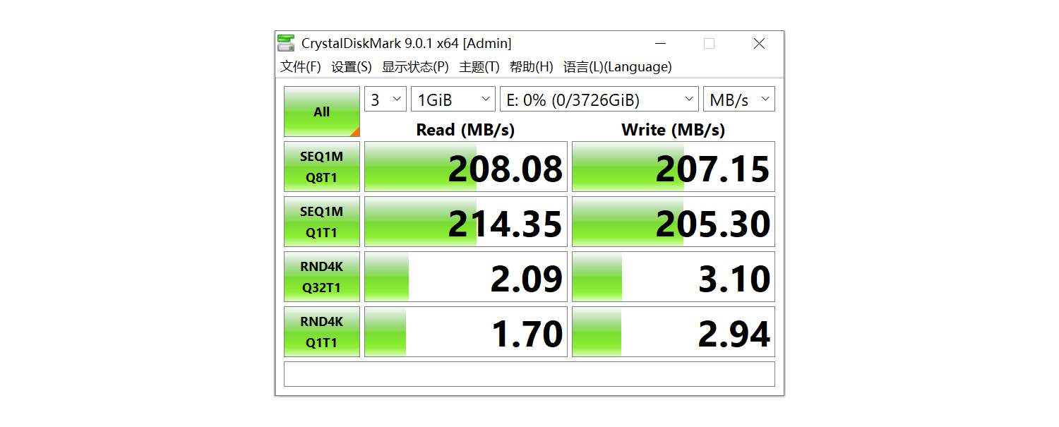 CrystalDiskMark基准测试,硬盘的顺序读取速度为208.08 MB/s,顺序写入速度为207.15 MB/s,4K随机读取速度为1.7 MB/s,这在机械硬盘中算是优秀水平了。