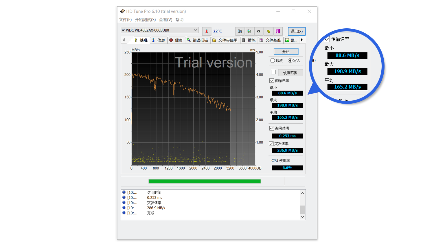 在HD Tune Pro测试中,西部数据蓝盘的读取速度表现优异:最小值达到123 MB/s,最大值升至201 MB/s,平均值稳定在168 MB/s。写入测试同样出色,最低速度为88.6 MB/s,最高速度为198.9 MB/s,平均值为165.2 MB/s。