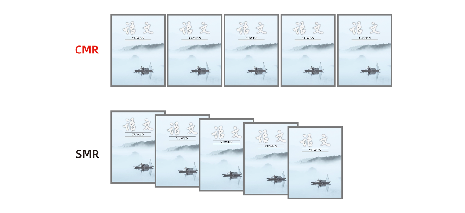 SMR:为了缩小占用面积,将5本书像瓦片一样叠压放置。抽取中间的书时,需要先托住相邻的书本防止倒塌。当你要频繁的抽拿书籍时,效率就会降低。