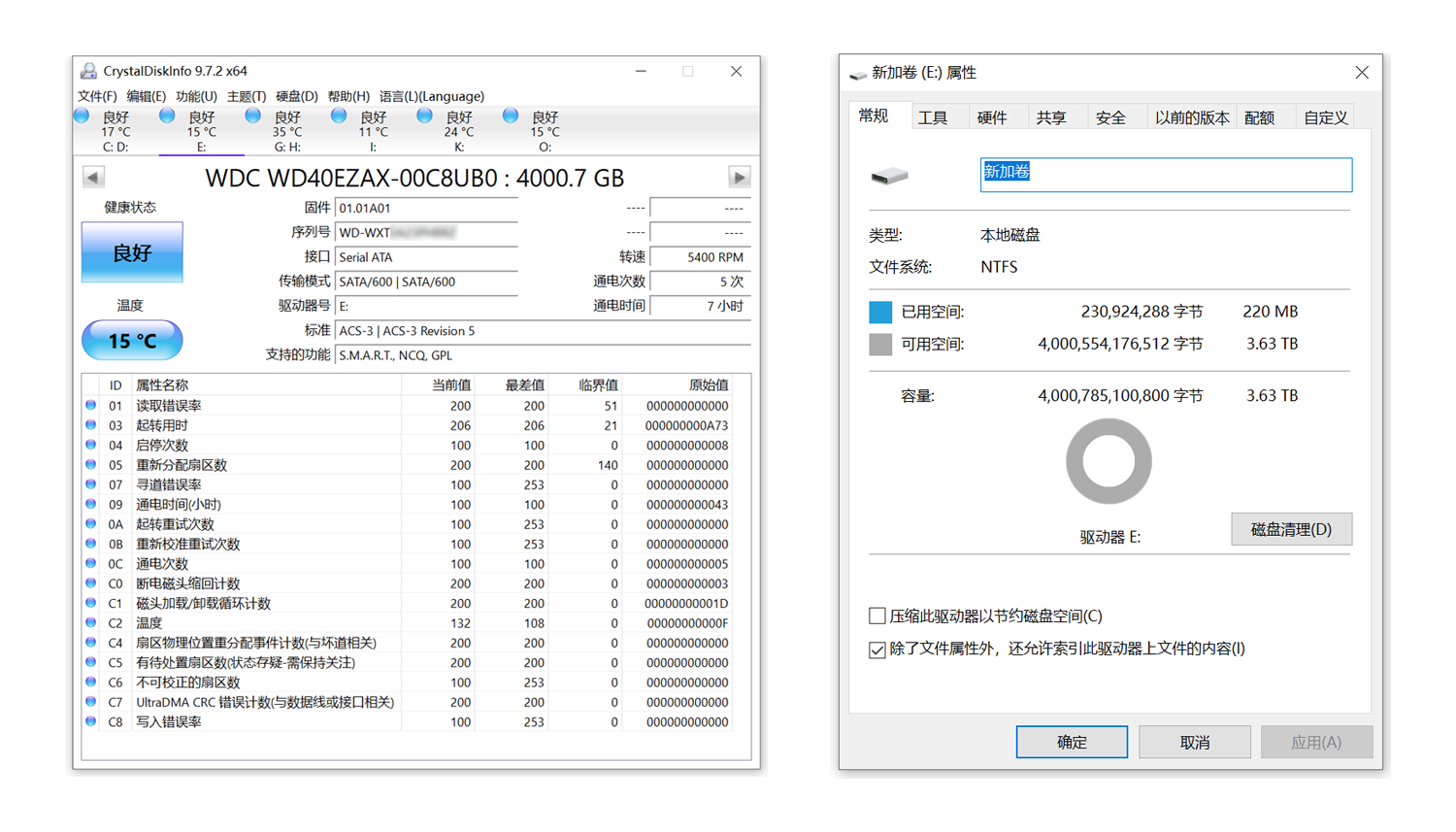 首先,我们使用CrystalDiskInfo软件读取西部数据蓝盘的信息。该硬盘型号为WDC WD40EZAX-00C8UB0,传输模式SATA/600,转速5400 RPM,符合ACS-3 Revision 5标准,并支持S.M.A.R.T.、NCQ和GPL功能,待机温度为15℃,整体表现可靠。