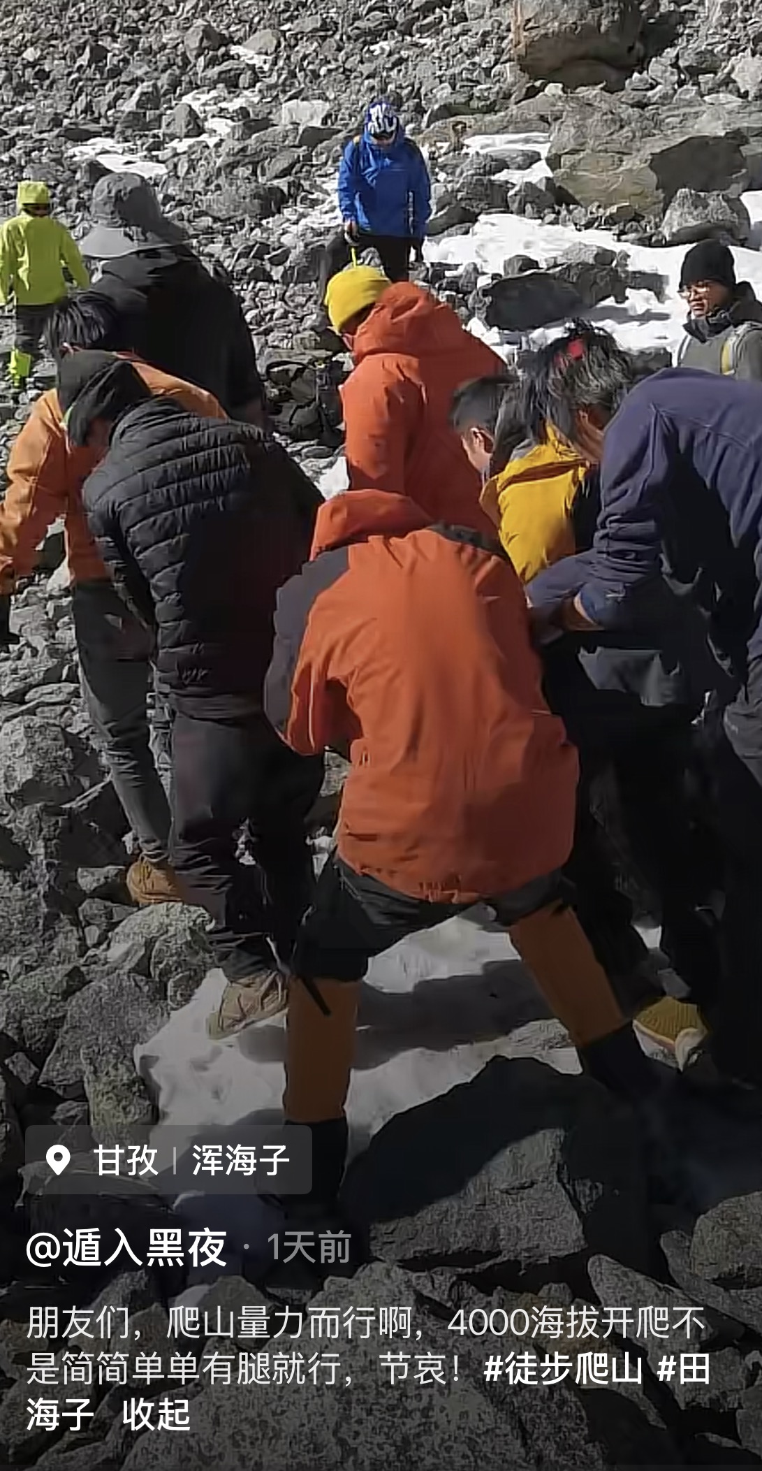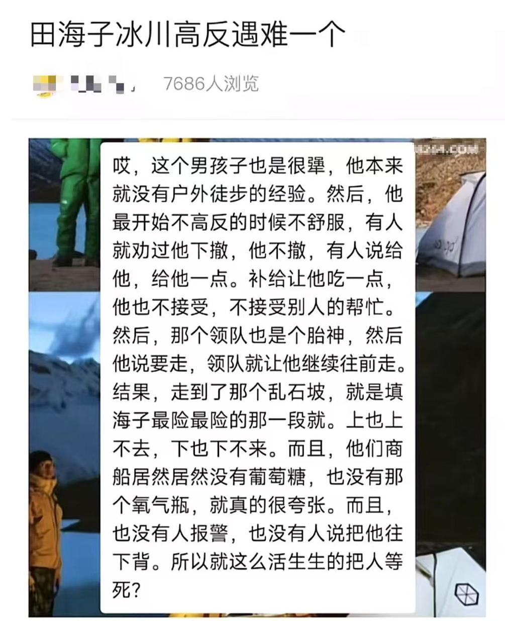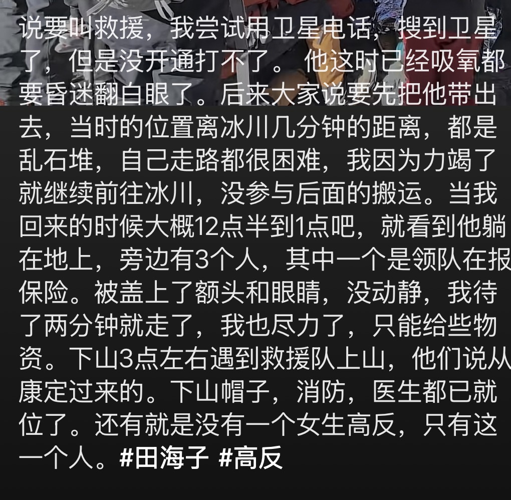 事情的起因是有网友在社交平台发布了救援视频,提到自己在田海子山参加了一场救援,感慨道“朋友们,爬山量力而行啊,4000米海拔并不是简简单单的有腿就行,节哀”。