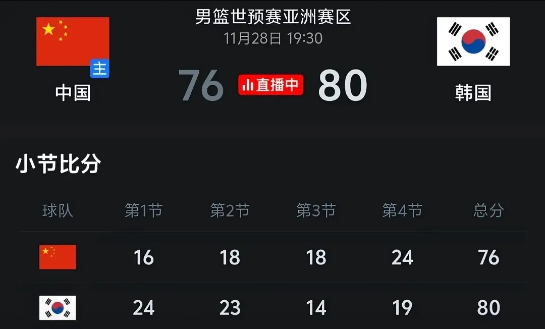 在三天前,双方第一场比赛中,经过四节苦战,中国队以76-80不敌韩国队,分差只有4分,但过程上中国队是一场完败,全场遭到压制,难以展开有效反击,若不是第4节最后几分钟,韩国见胜局已定,全队压时间打,分差将超过10分。