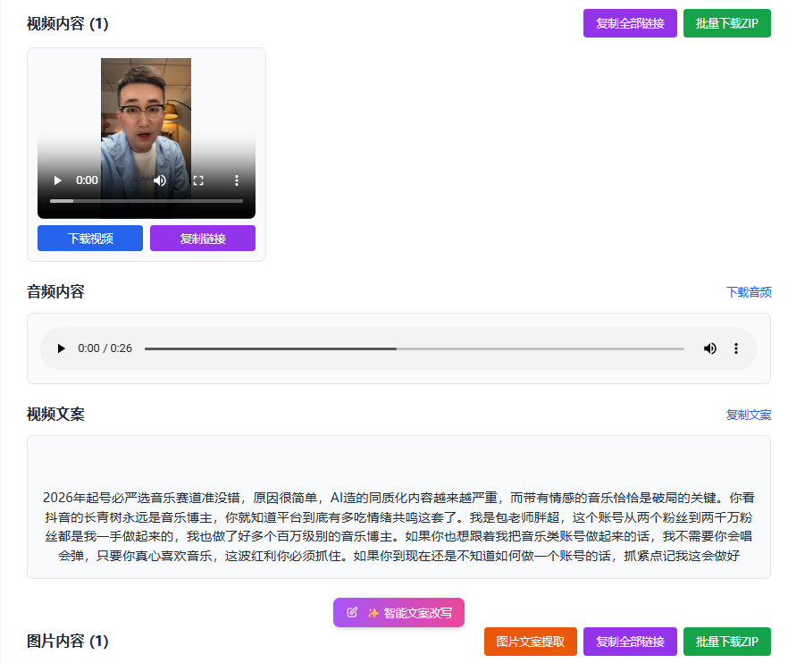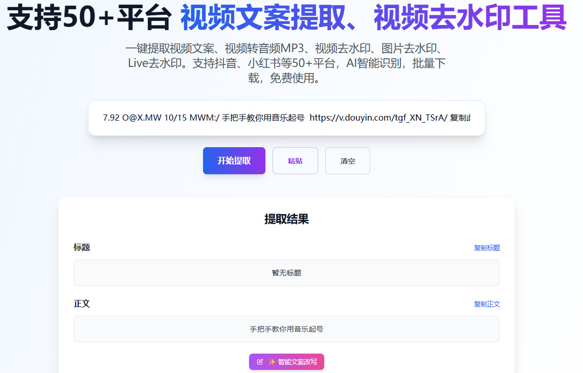 这是一个可以提取文案,音频和视频的免费网站! 支持 50 多个主流平台。操作简单,你只需要把链接粘贴过来,不管是图文、音频还是视频,可以直接提取出来,而且不限次数使用、免费,主打的就是一个全能且良心!