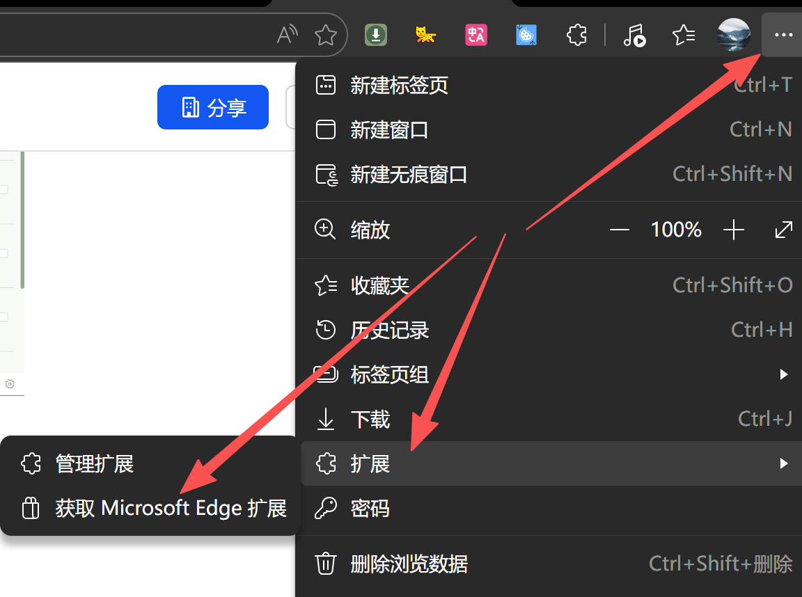 在浏览器右上角打开“...”按钮——点击“扩展”——打开“获取扩展”,如下图所示