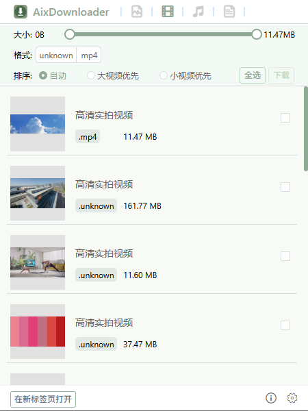 2、视频下载:下载互联网中的任何视频。只要在含有所想要的视频网页上打开应用,选择所需要的视频,即可下载。支持批量下载、按大小筛选视频、视频排序,支持MP4, MOV, FLV, AVI, WMV, MKV, MPG等格式。