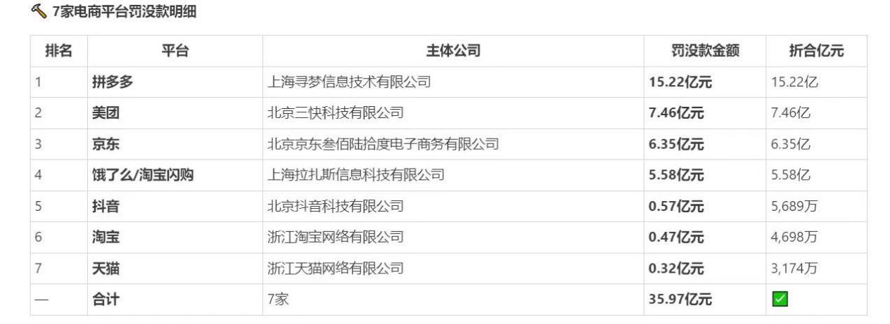 7电商平台被罚35.97亿元,拼多多15.22亿,美团7.46亿,京东6.35亿,淘宝闪购5.58亿,抖音0.57亿,淘宝0.47亿,天猫0.32亿