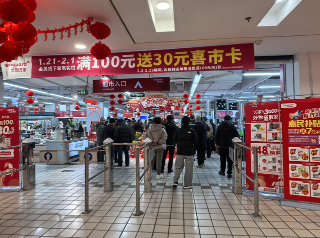 据了解,1月21日至2月1日期间,华润万家超市推出会员专享福利:单笔实付满100元送30元喜市卡,每个会员最多可获2张。喜市卡可在2月2日至2月23日期间使用,相当于七折优惠。更贴心的是,会员单笔消费满48元,就能享受超值换购机会:10元换购恒顺香醋、9元换购香满园纯芝麻油,或者仅1元换购雪花啤酒一听或白萝卜一根。这样的优惠力度让不少精打细算的顾客直呼“真香”。
