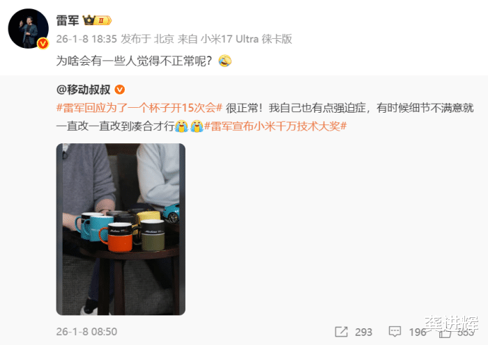 雷军强调,不是只为了这个杯子开会,“我们重要的产品都会参会讨论,一次会议会讨论很多重要的产品,不是只有杯子,更不是只为了这个杯子开会。”他透露,做Ultra这个杯子的主要目的是还原出小米SU7 Ultra车漆的质感和颜色,才会开这么多次会,并改动这么多次,包括颜色、材质(陶瓷改成金属)。