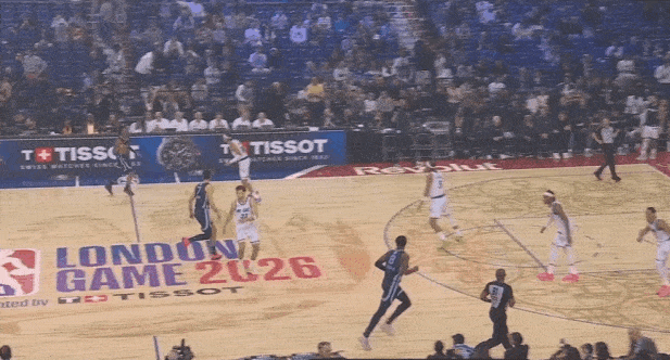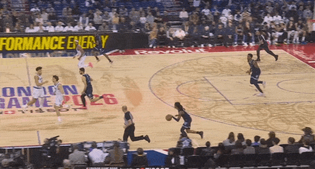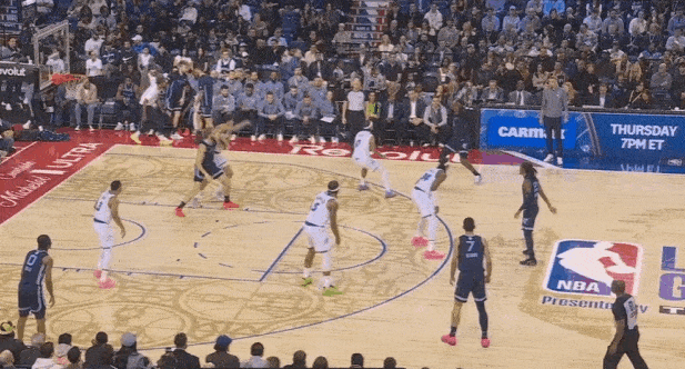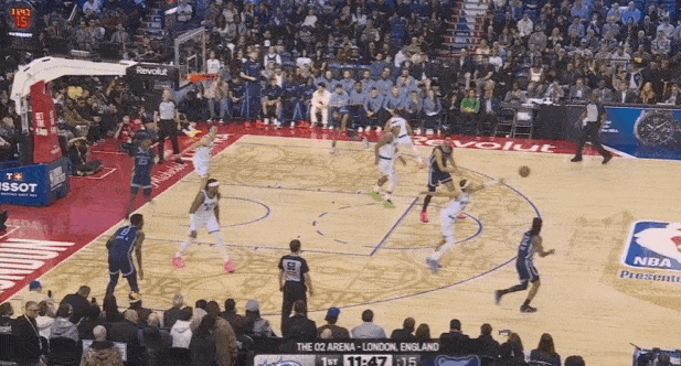 莫兰特上提接球后立即和阿尔达马发动弧顶挡拆发起,行进间吸引弱侧回收协防后立即单手“三点一线”大横传找到外线被放空的JJJ。