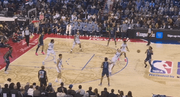 莫兰特右路跟进后顺势启动空切直杀篮下,接阿尔达马击地球领人后低位遭遇双人夹击,立即找到空切至近框区域接应的考沃德。