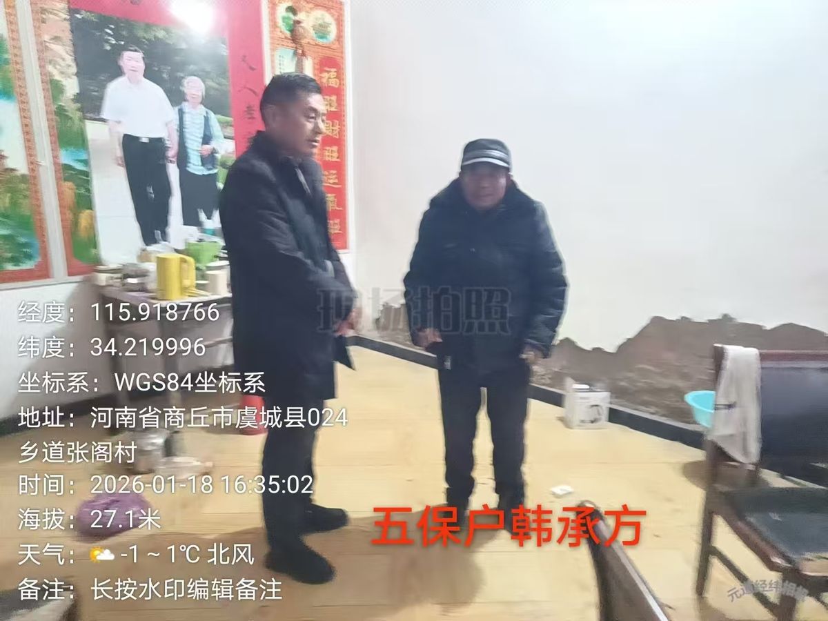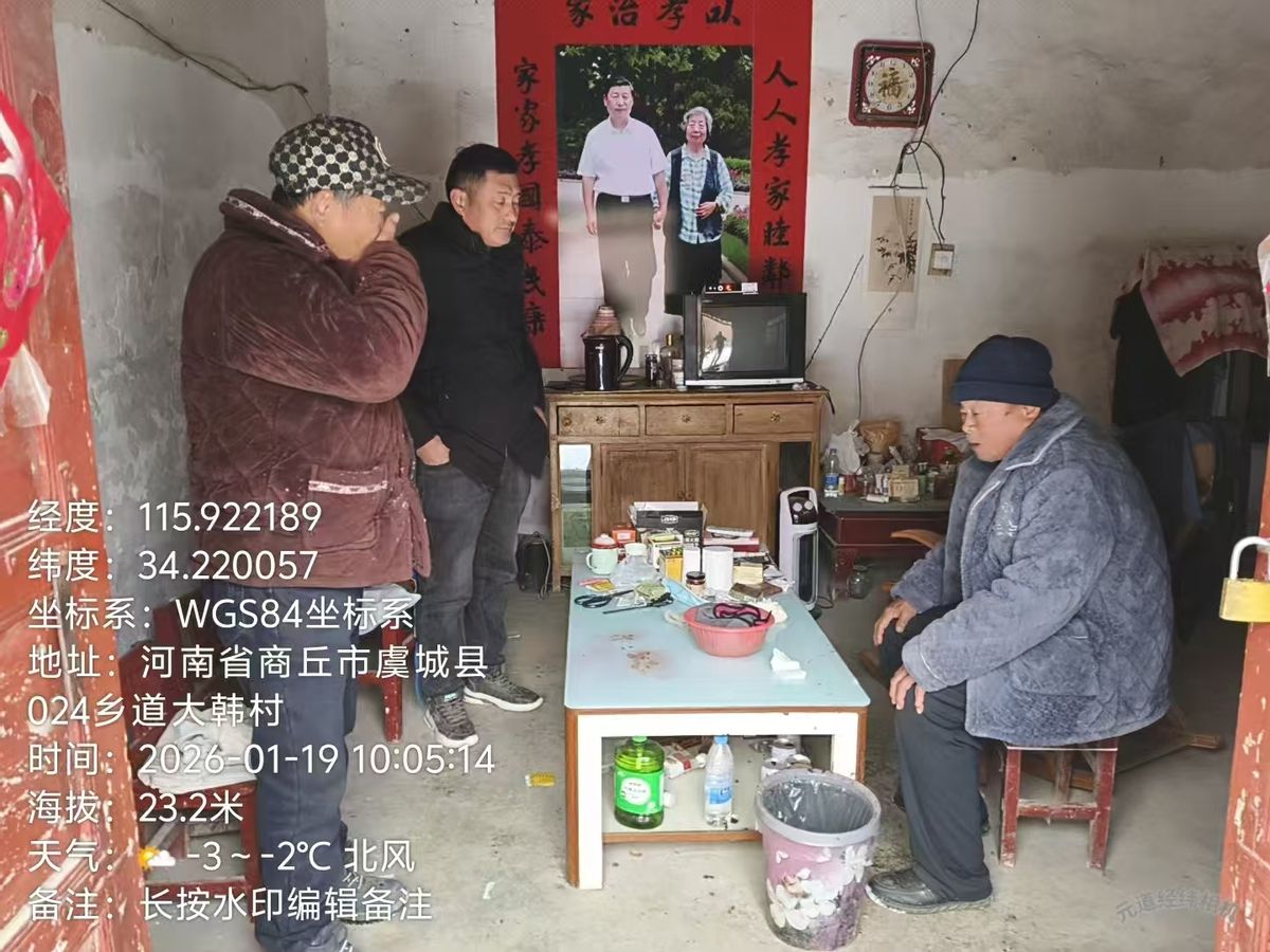 腊月初一(2026年1月19日)清晨,雪花漫天飞舞,严寒笼罩着中原大地。一支特殊的队伍踏着积雪穿梭在村巷间,在基层党组织组长韩军广书记的带领下,以孝治家试点单位——河南省虞城县闻集乡韩庄村的三支队伍义工们,顶风冒雪挨家挨户走访排查灾情。